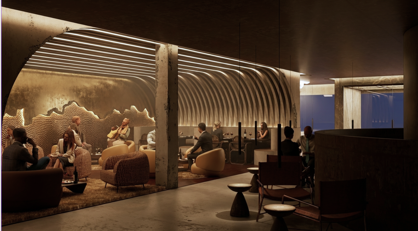 add sheer burgundy curtains only to the blue window glazing in the far background on the right side of the image curtains should be positioned directly in front of the glass spanning the width of the window opening hanging from ceiling height to just above the floor the fabric should be lightweight translucent and softly draped allowing faint visibility through to a darker nighttime exterior beyond do not add curtains anywhere else in the image do not place curtains in the foreground midground or along any interior partitions slatted walls or seating areas maintain all existing geometry lighting materials and composition exactly as shown