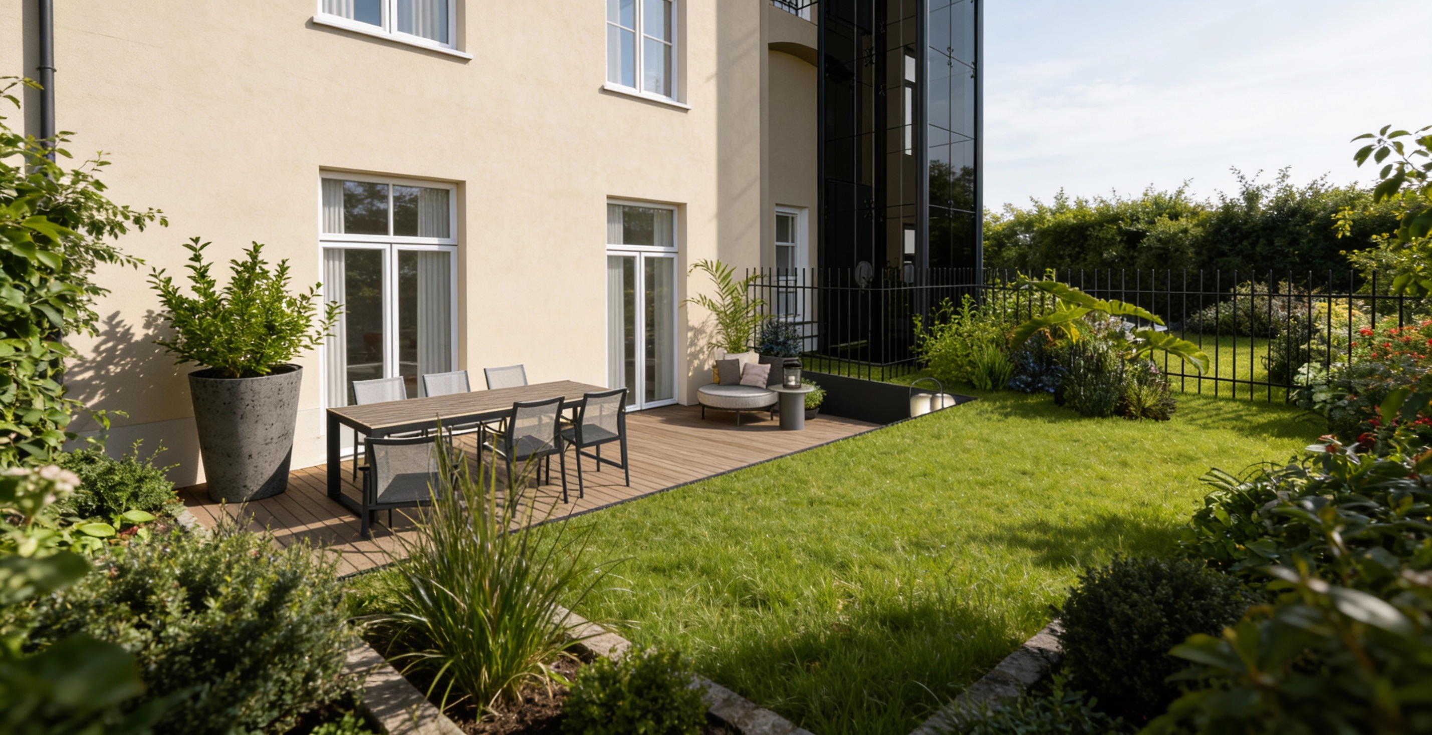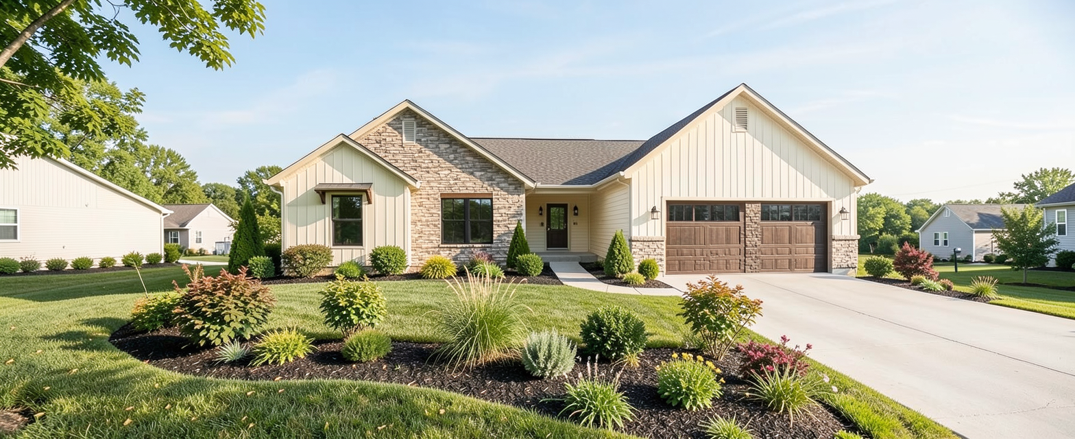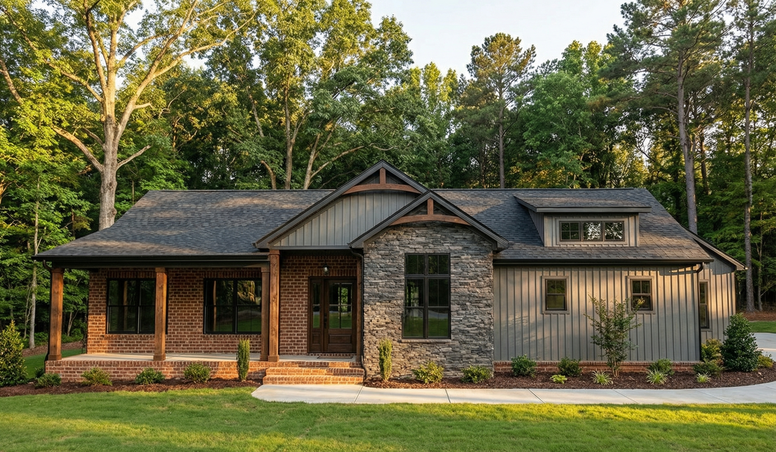 ultra realistic photograph of a traditional stone country house with natural fieldstone masonry with realistic texture variation and brown tones and taupe siding black window and door sashes multi pane windows with subtle reflections slate roof on second floor copper roof over front door covered porch with arched windows triangular paneless window in gable manicured shrubs and landscaping mature trees in the background soft natural daylight realistic shadows accurate proportions architectural photography dslr photo 35mm lens shallow depth of field global illumination high dynamic range ultra detailed 8k realism true to life materials cinematic yet natural color grading