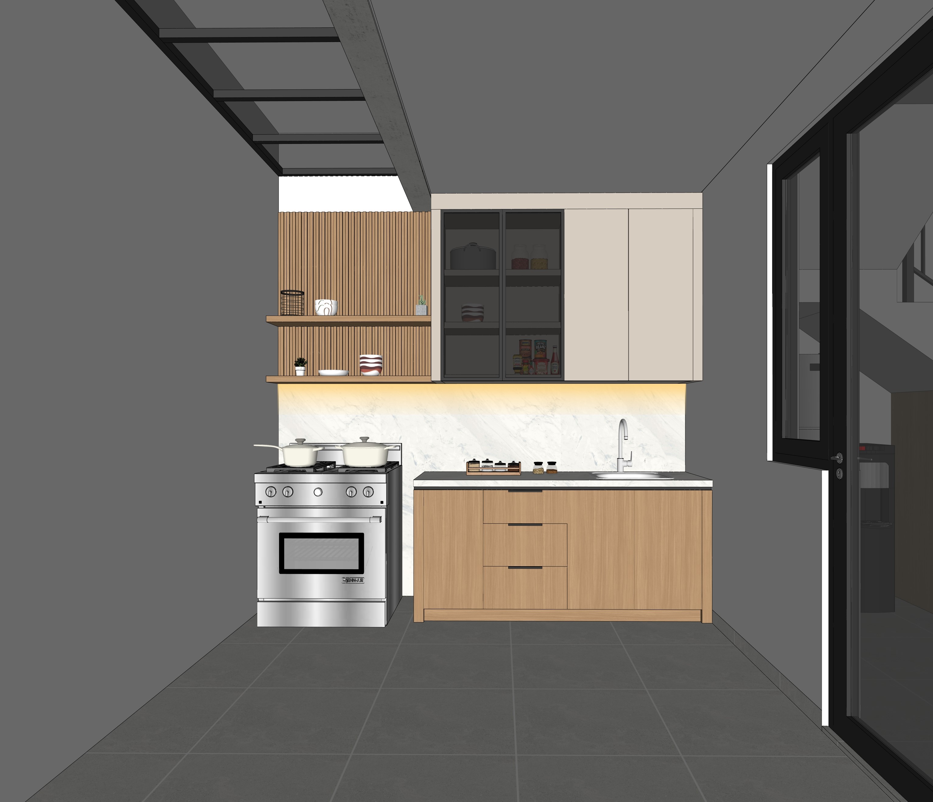 create a photorealistic scandinavian minimalist kitchen render keeping the exact same kitchen layout proportions doors windows and structural elements as the reference image with no changes to the kitchen set design floor finished with soft light grey marble matte surface subtle texture and low reflection ceiling in clean matte white walls in soft white matte paint lower cabinets in natural oak tones with realistic and warm wood grain texture upper cabinets in a combination of natural oak tones and light mocha color featuring a continuous warm white led strip installed underneath the upper cabinets running along the entire kitchen length the center upper cabinet doors are dark smoked black glass with black matte frames inside this glass cabinet warm white led strip lighting is installed on every shelf including the top most shelf evenly illuminating the interior from top to bottom in a refined and elegant way the left upper section consists of open shelving with a vertical wooden slat background in natural oak tones adding scandinavian warmth and texture on the upper left side include a skylight with a black metal frame allowing soft natural daylight to enter the space and cast realistic natural shadows on the right side of the kitchen keep the existing door and window exactly as shown in the original image with black frames maintaining their position size and proportions without alteration the kitchen remains visually connected to the dining area where a refrigerator and water dispenser are subtly visible in the background lighting combines natural daylight from the skylight and warm artificial led lighting creating a clean warm scandinavian atmosphere use high quality materials realistic textures soft shadows global illumination ambient occlusion cinematic lighting ultra detailed photorealistic render high resolution