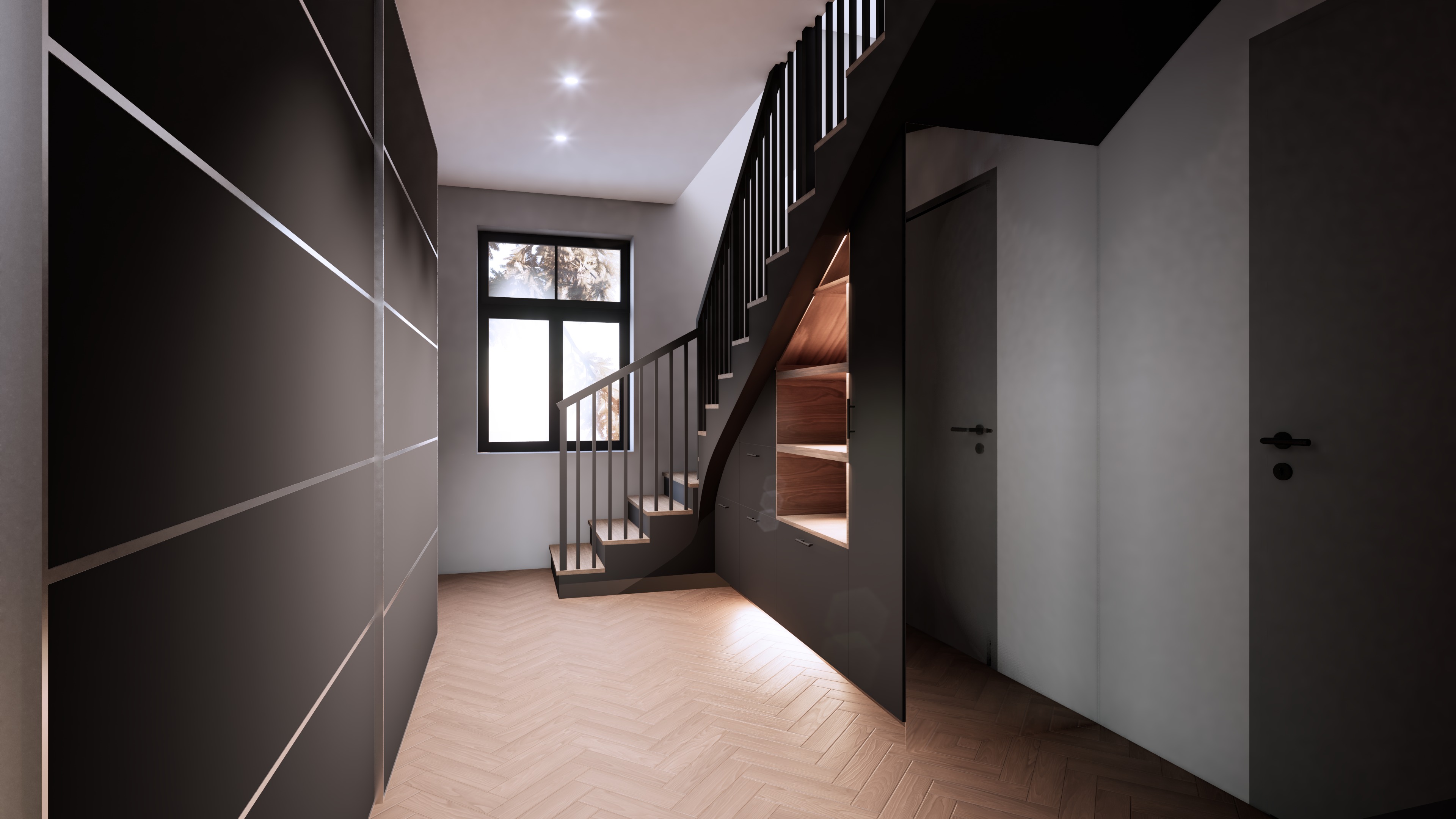 hallway in dark tones modern style accessories on shelves baseboards dark gray roman shade place a suitable rug in the center of the floor on the right side next to the door on the white wall add black and white pictures make it photorealistic