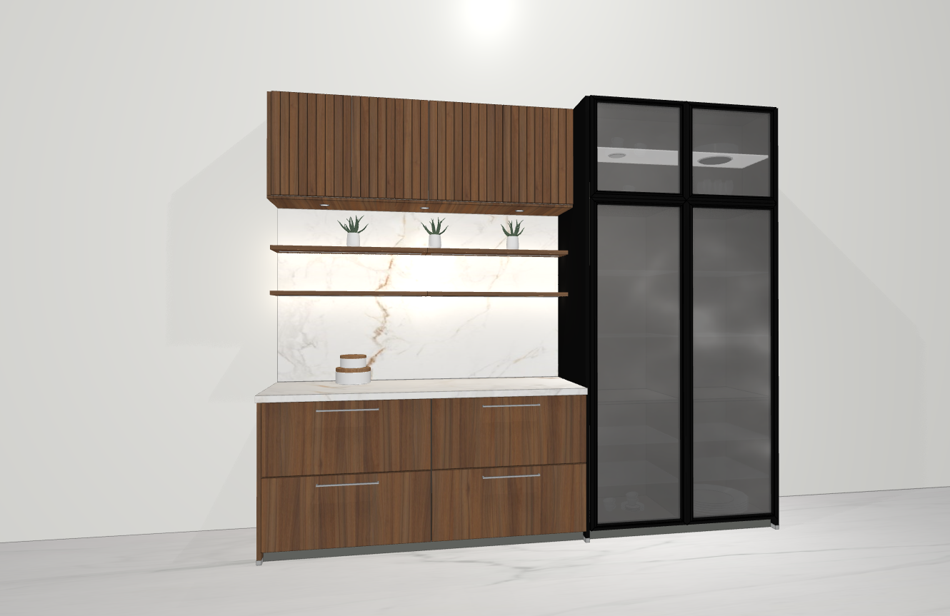 elegant bar dark walnut and with dark glass vertical soft lights inside the glass tall unit nothing reflected on the glass