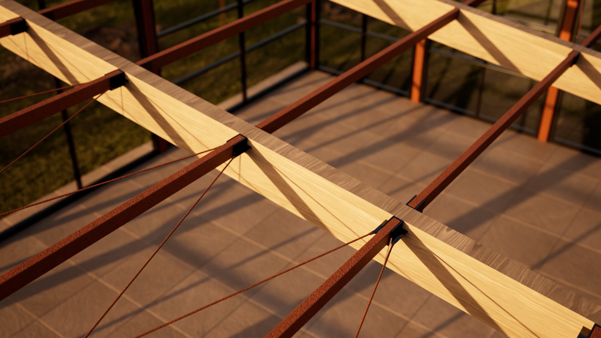 rendi l immagine pi realistica questa struttura fatta di legno metallo gli elementi neri e in corten gli elementi marroni