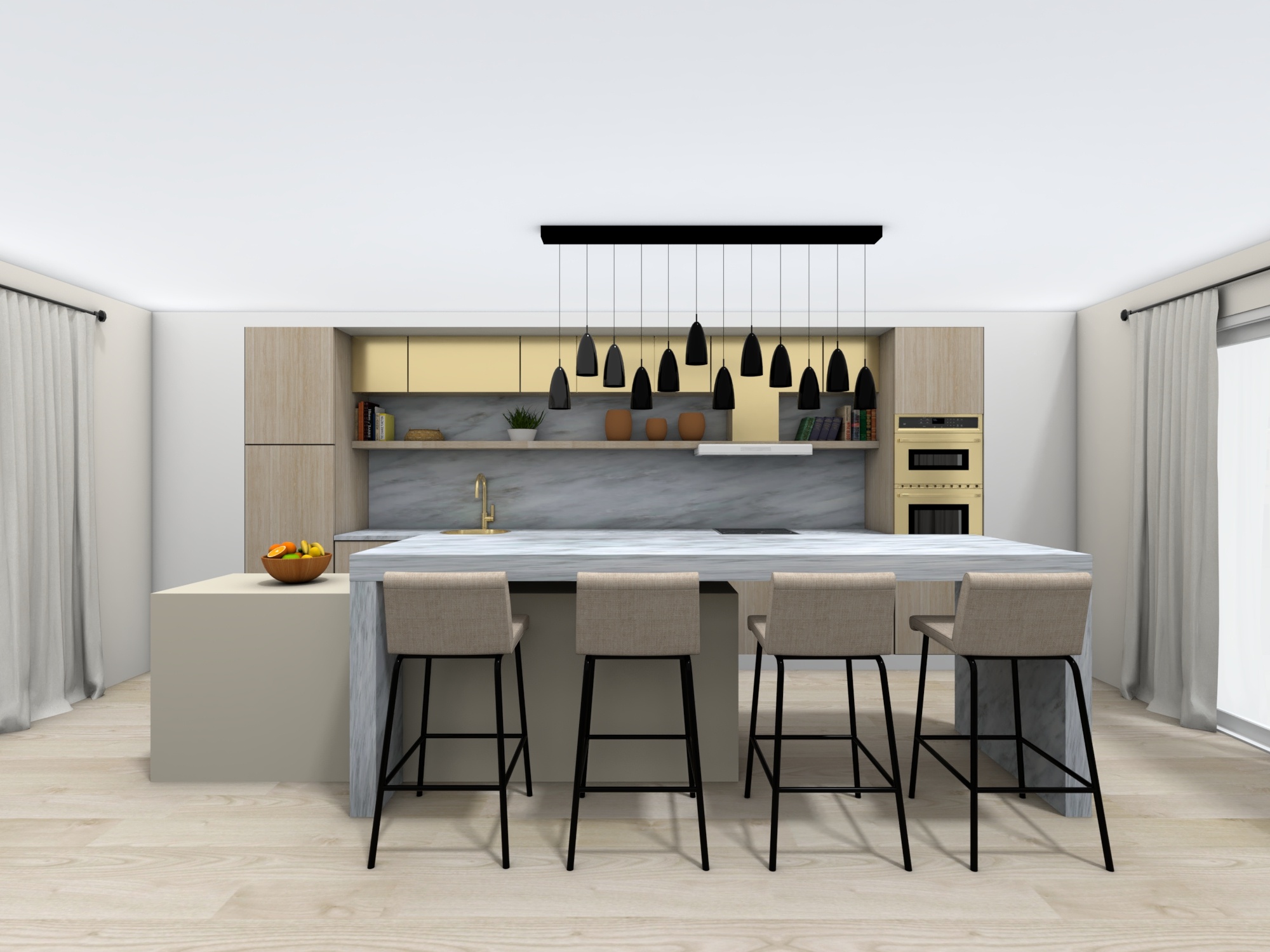 a contemporary kitchen with a stylish and modern design the central feature is a large marble island with a unique irregular shape complemented by four high stools with beige fabric seats and black metal frames above the island a sleek black pendant light fixture with multiple black pendant lamps adds a dramatic touch the closed cabinetry is a mix of light wood and white tones the appliances including an oven and hood are modern and integrated seamlessly into the design the floor is light wood and the space is well lit with natural light streaming in through large windows framed by light transparent curtains architecture
