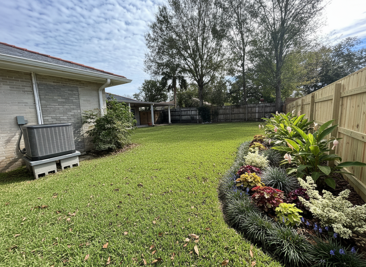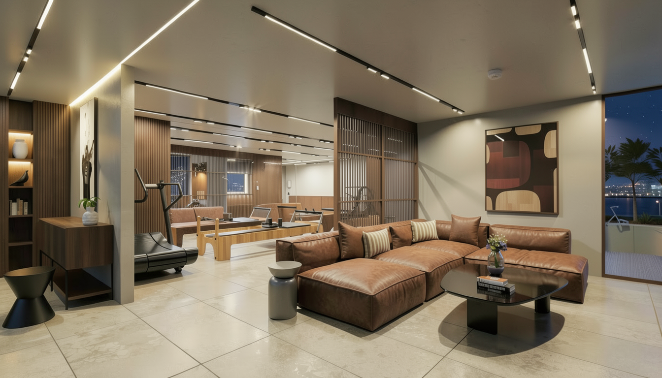 stucco building with gray clay shingles south florida style light green storm covers for windows with landscaping and palm trees around and a golf course in the background
