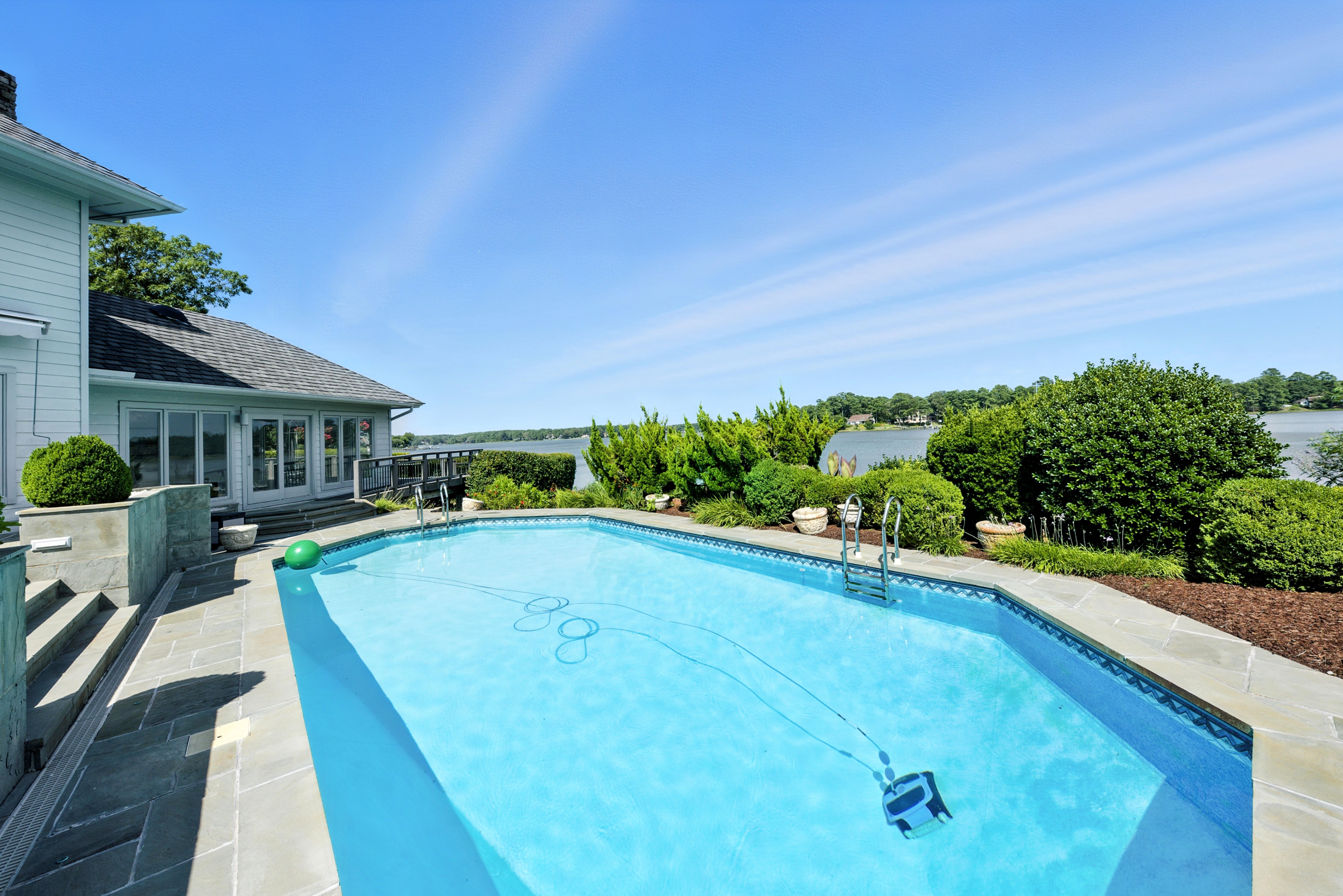please change this pool so that one side has a large 10 foot wide lounge step with in water lounge seating please add additional pool stairs after the lounge step then on the deep end of the pool please make a seating bench around the side please change the pool waterline tile to a zellige vertial light sky blue 12x3 subway tile please remove the current metal stair rail and add a single pool rail to one side of the steps