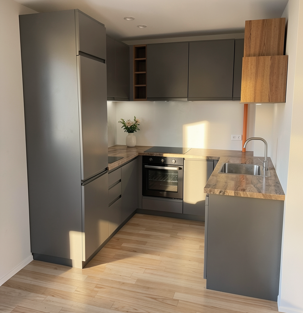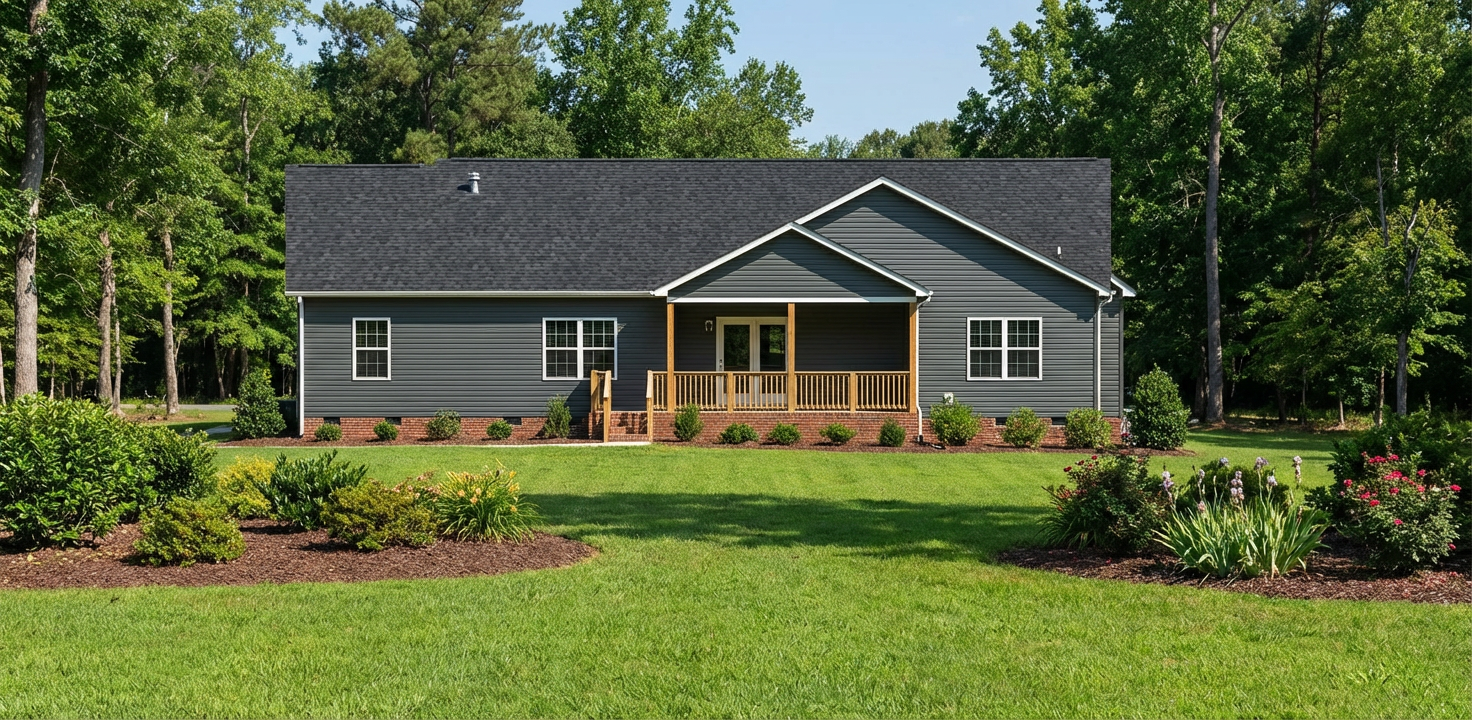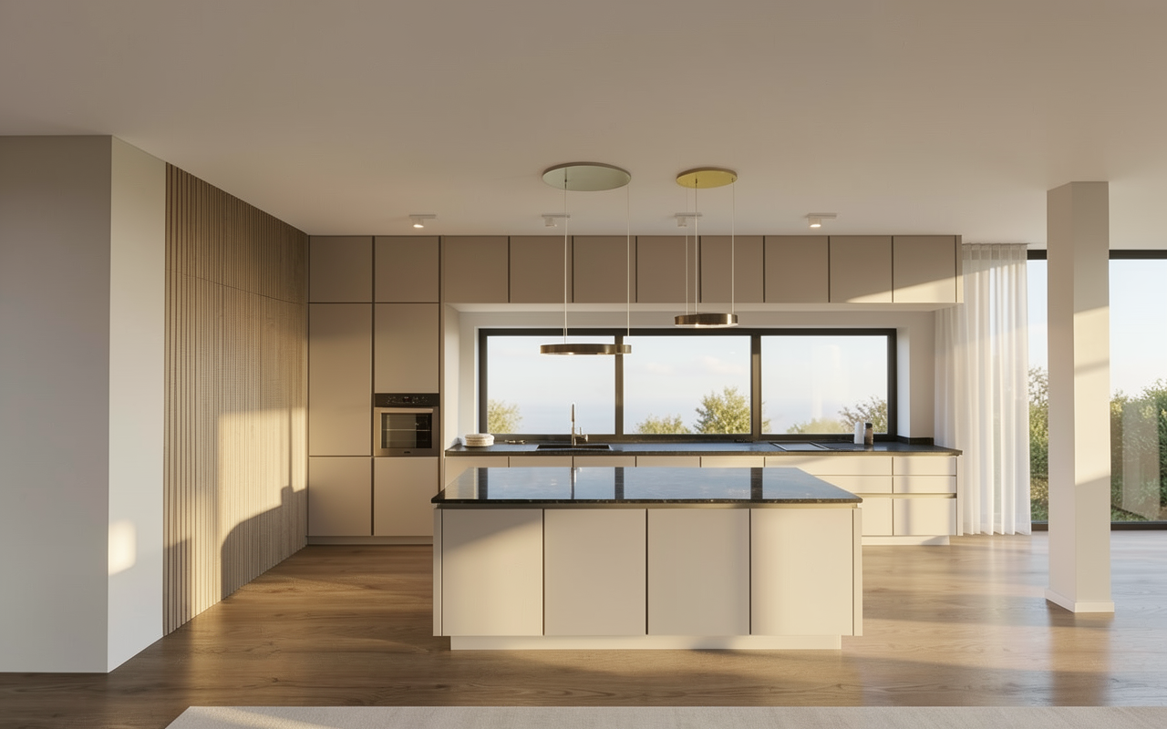 modernist exterior shot please make an architectural render of this image do not change the perspective and aspect ratio make the setting on a mountain with a subtle sunrise scene and add a subtle misty horizon please make the mountains shorter and a more vegetation please add a hint of sunrise make it a little warm architecture