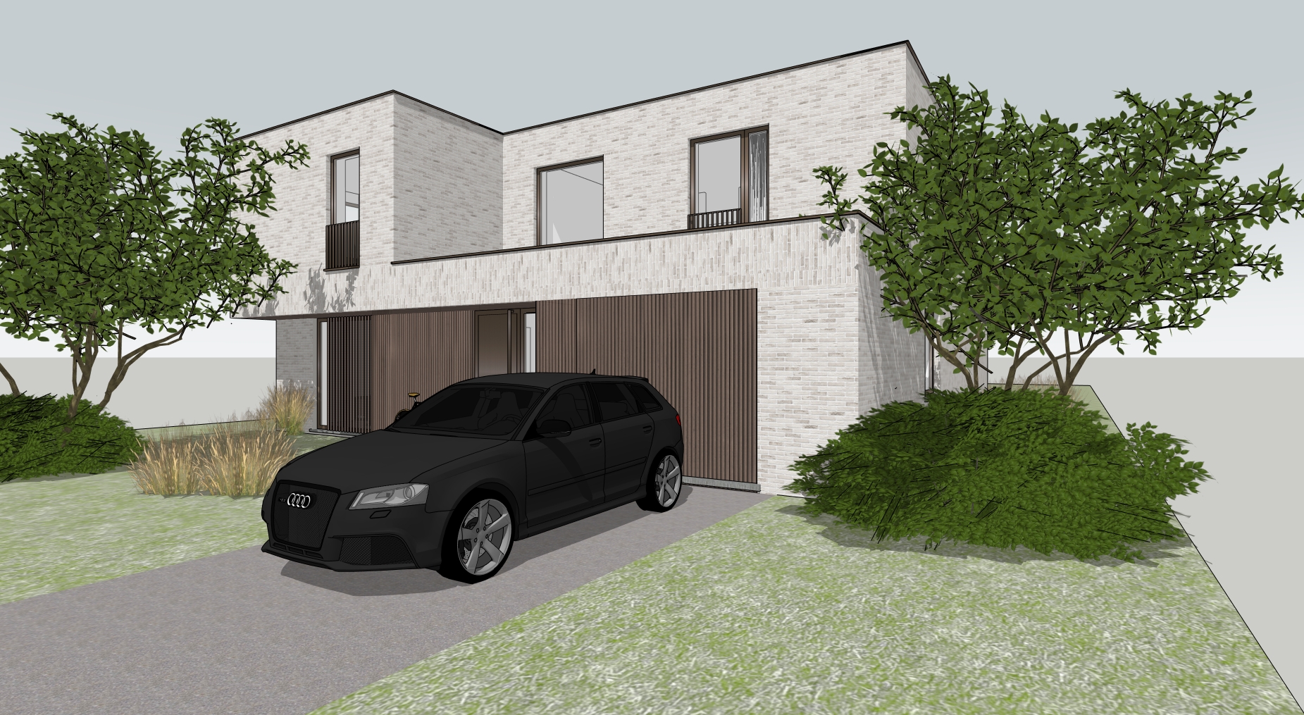 ultra realistic architectural exterior render of a modern residential house the fa ade is made of camargue carrera facing bricks from heylen ceramics with realistic texture subtle white grey color variation and natural mortar joints directly above the windows the fa ade bricks are laid in a rotated bond with the bricks oriented vertically instead of horizontally clearly visible and accurately detailed aluminium window frames in supranodic collection bronze with realistic reflections and glass natural landscape surroundings neutral environment soft daylight realistic shadows photorealistic high detail architectural visualization audi a3 int the driveway the front fa ade features vertical afromosia wood slats with warm tones and visible natural wood grain in a grey warm tone