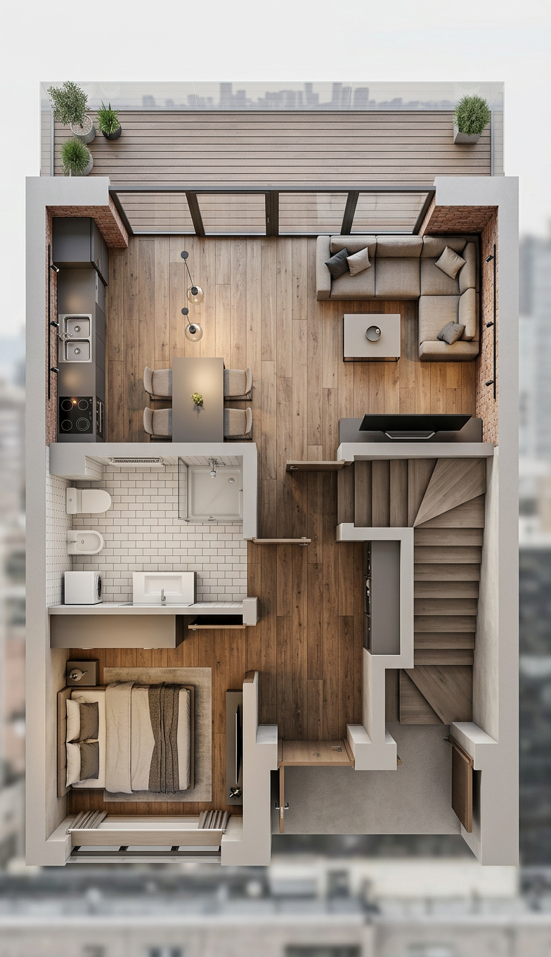 convert this floor plan into a modern isometric 3d view of a full house show the space from an elevated angle with furniture walls and details visible do not show descriptions loft style apartment the stairs go up to another apartment the door next to the stairs leads to the room under the stairs use the same furniture as shows on the plan do not change the orientation of the floorplan