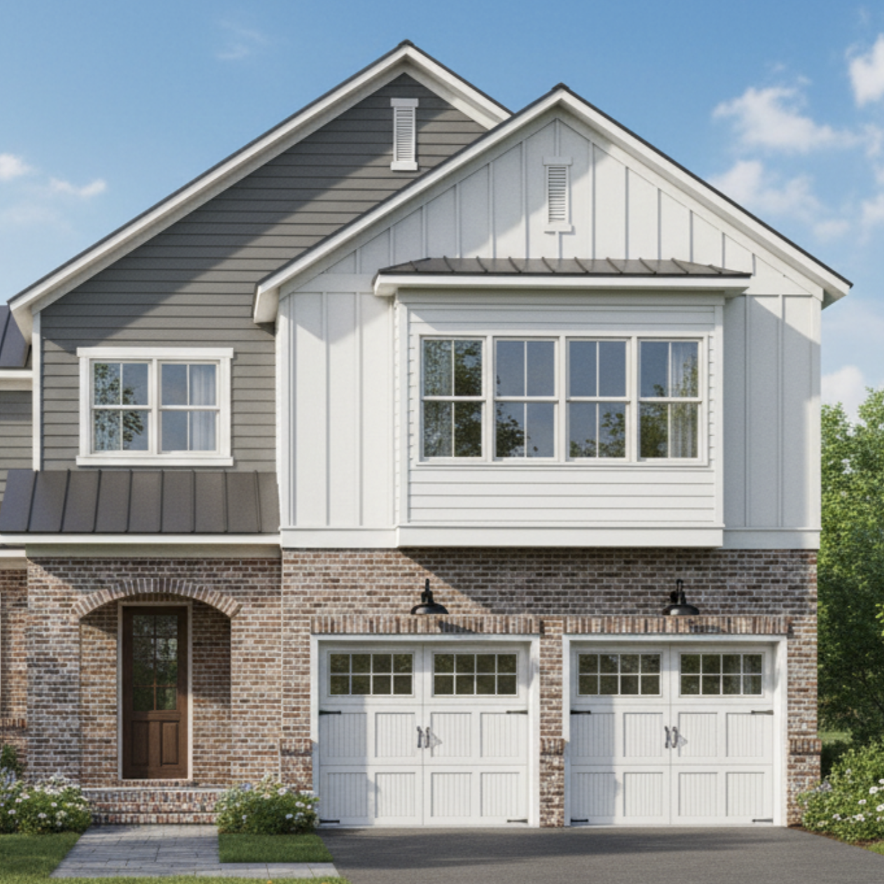 keep the exterior as it is but change the design so the front of the home is mostly brick the dormer is painted a charcoal color