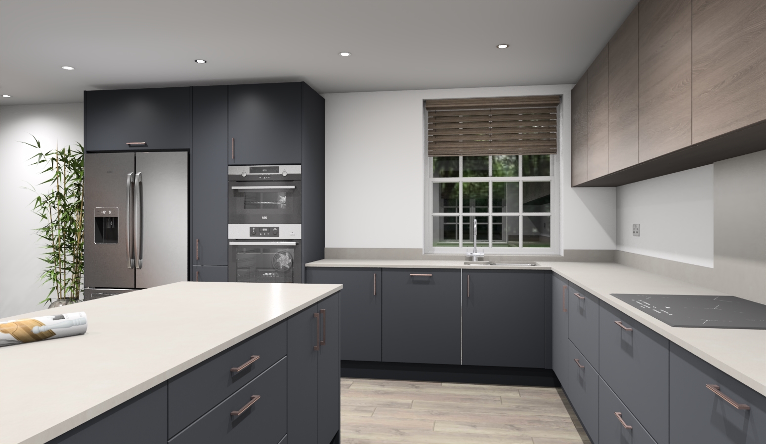 make this image 8k hyper realistic as if it were taken via an iphone camera artificial lighting should beautifully blend with natural lighting showing the subtle grain effect on the painted ash kitchen door keep dimensions the same and in a landscape format keep dimensions the same midday sunlight coming through large windows casting realistic shadows and reflections shot with a dslr camera 35mm lens shallow depth of field ultra high resolution photorealistic ray tracing global illumination highly detailed textures realistic lighting cinematic composition