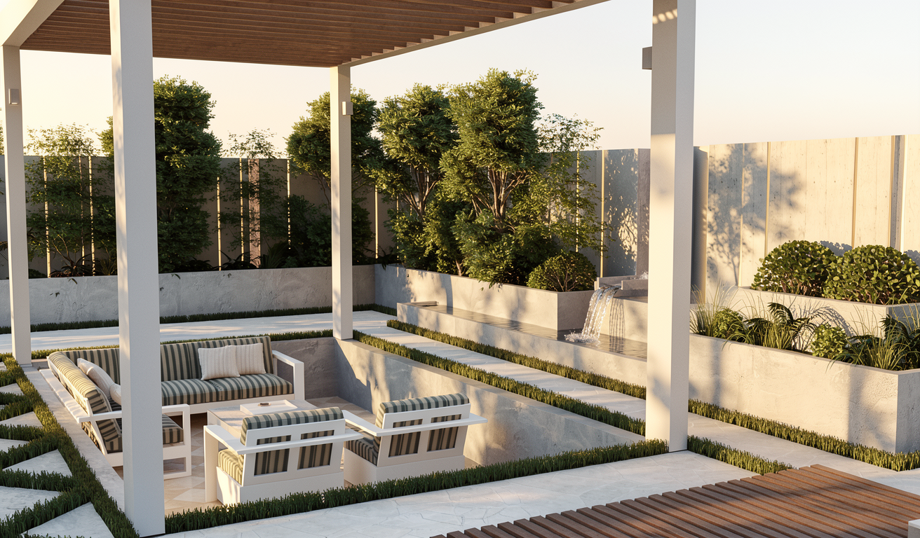 realistic gray brown siding and dark brown trim bright sunny day light wood fence and gray wood stairs with black railing