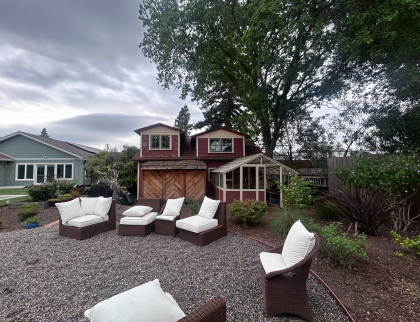 remove all furniture remove all attached structure to the barn and chage color to light cream and blue grey trim details