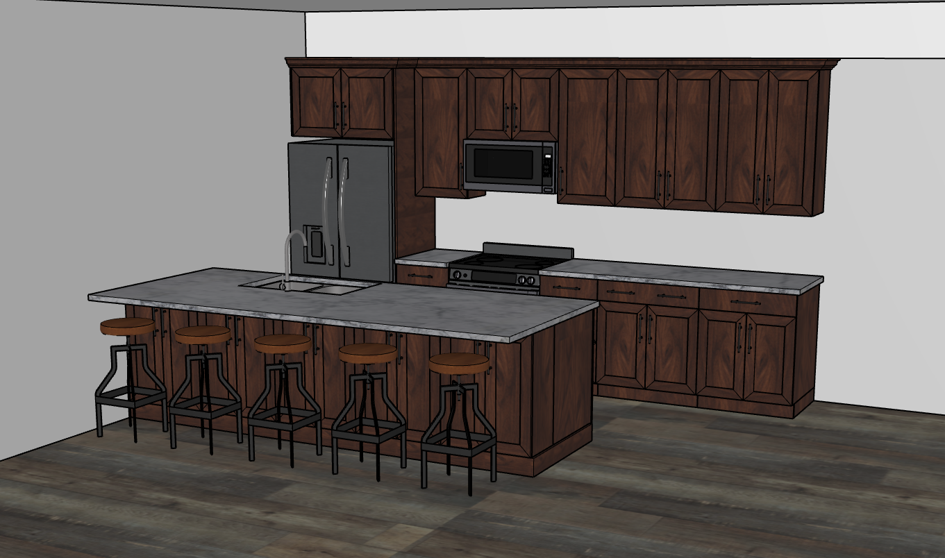 this is a beautiful kitchen with cabinets made of natural stained walnut the handles are all a matt black all appliances are a modern stainless steel the countertops are a beautiful white marble the flooring is a nice modern medium light rustic lvp flooring this kitchen has lots of natural light coming in from behind the camera the cabinets go up to a soffit in the ceiling that drops down about 14in and extends off the wall about 15in the peninsula buts right up to the wall on the left