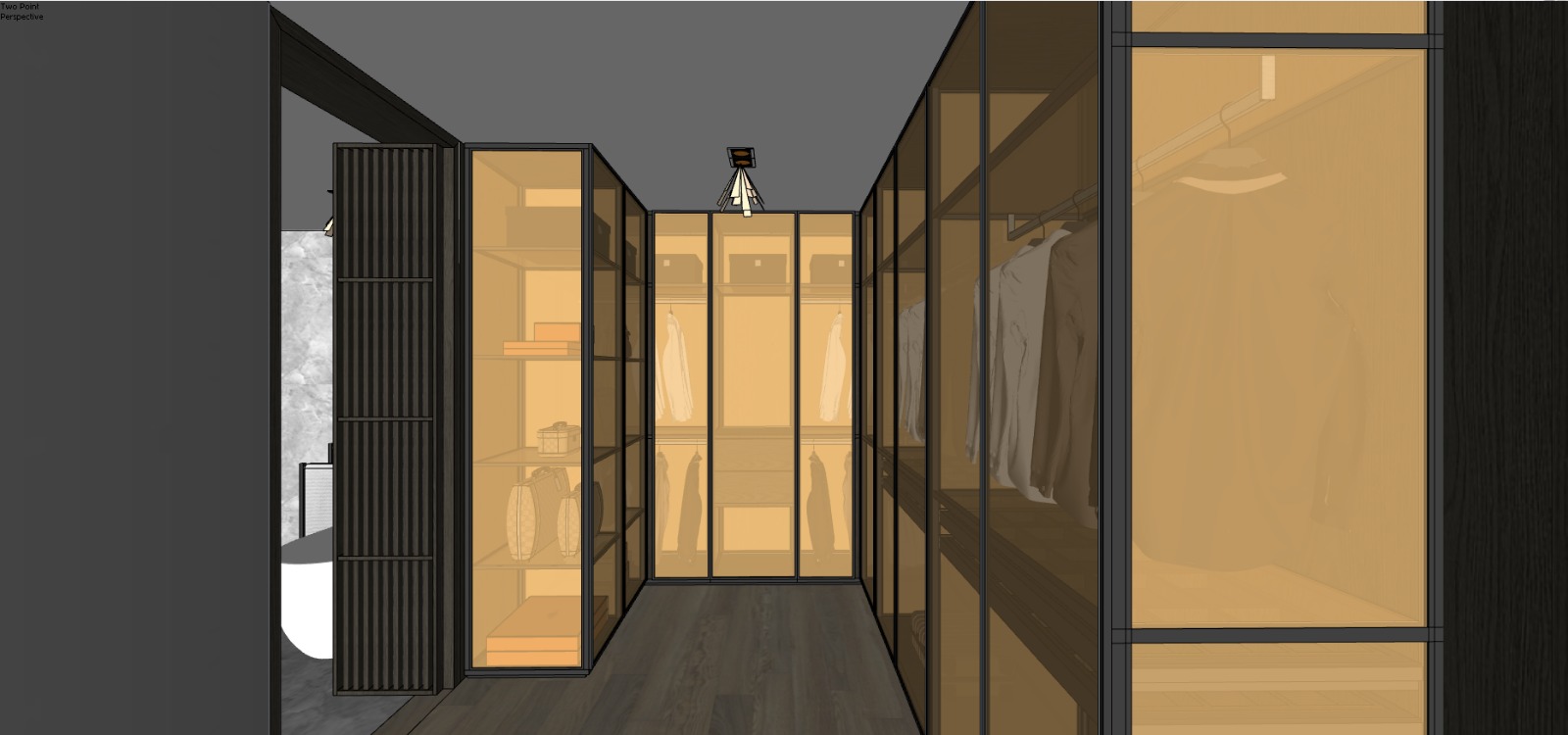 render this walk in wardrobe sketchup model as a photorealistic interior visualization matching the mood and style of the reference image apply the following lighting remove the ceiling pendant spotlight fixture entirely light the interior of the wardrobe from within add warm amber led strip lighting inside each glass wardrobe cabinet illuminating shelves hanging rails and folded items from the inside out exactly like the reference the overall room ambient light should be dim and moody with the internal cabinet glow being the primary light source creating a warm contrast against the dark ceiling and floor left wall replace the left slatted panel wall entirely with a full height mirror reflecting the wardrobe units opposite the mirror should have a dark metal or black frame edge to match the wardrobe frame finish glass frames render the glass wardrobe doors with dark bronze black steel frames and lightly tinted or clear glass panels allowing the warm interior lighting to glow through as seen in the reference materials interior wardrobe back panels warm greige wood veneer matching reference floor dark charcoal wood planks matte finish ceiling dark grey no fixtures style luxury boutique walk in wardrobe editorial quality render cinematic lighting no people