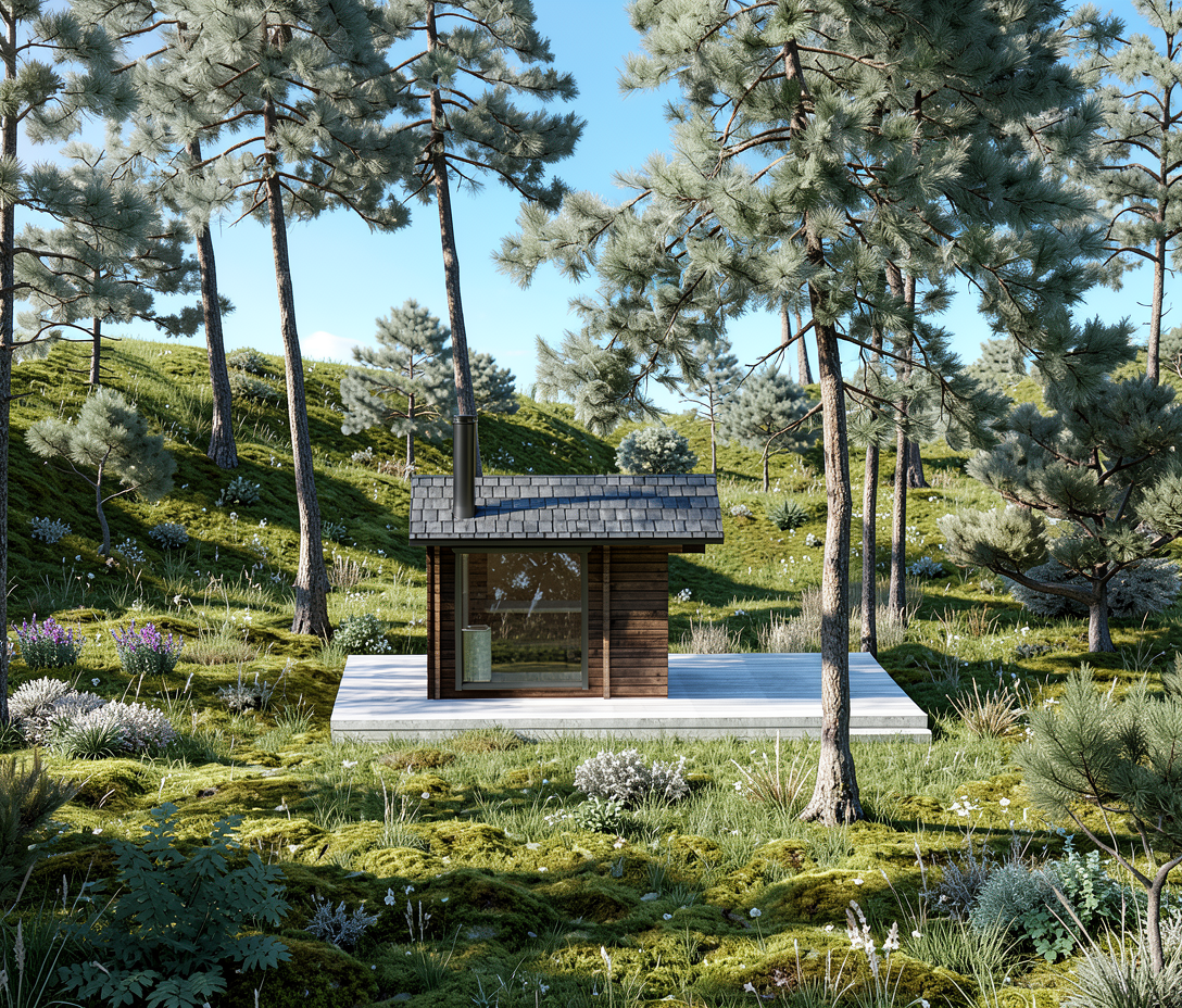 front view of a clean contemporary cabin architectural exterior home rendered in cinematic lighting with bits of blue skies and sunlight coming through the clouds cabin in a coastal setting with faint streaks of light coming through trees in the surrounding area warm glow and coastal reflections off of the windows cloudy and stormy sky shining rustic select grade vertical wood siding green manicured landscape around structure with gardens and patches of grass black standing seam metal roof prominent trees in the background high fidelity photorealistic visualization crisp shadow falloff refined facade geometry soft atmospheric depth premium architectural photography mood ultra clean composition and materials black window trim flat roof photorealistic render small concrete path around the exterior of the cabin hide concrete footings