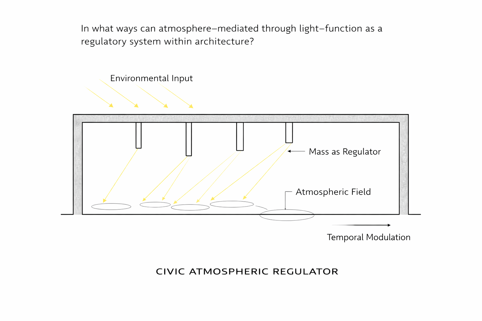 conceptual architectural visualization section perspective diagrammatic light modulation minimal human silhouettes for scale focus on light as spatial organizer