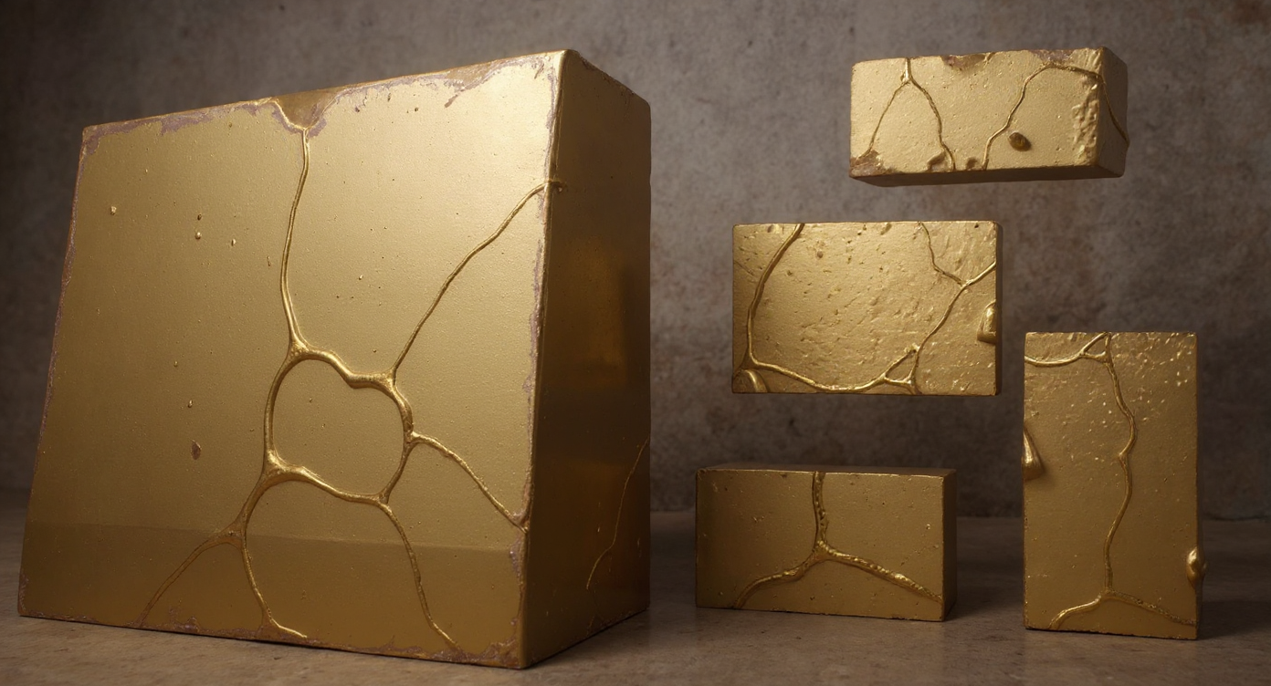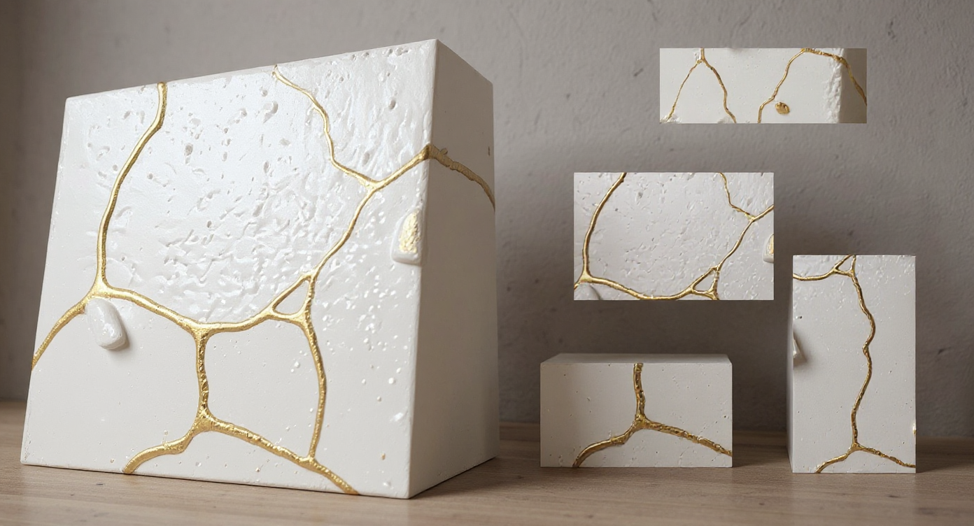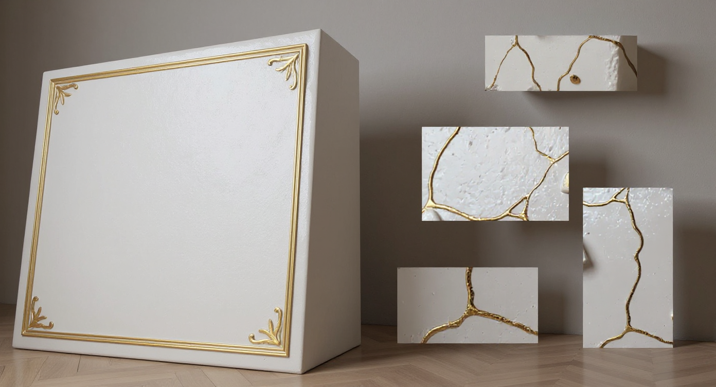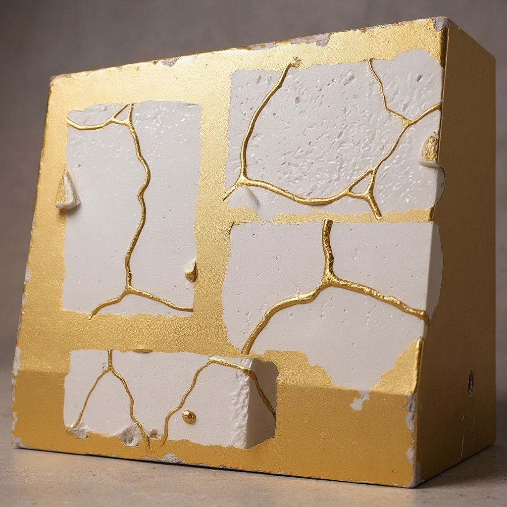 render this plaster kitchen hood with gold paint kintsugi keeping the background white