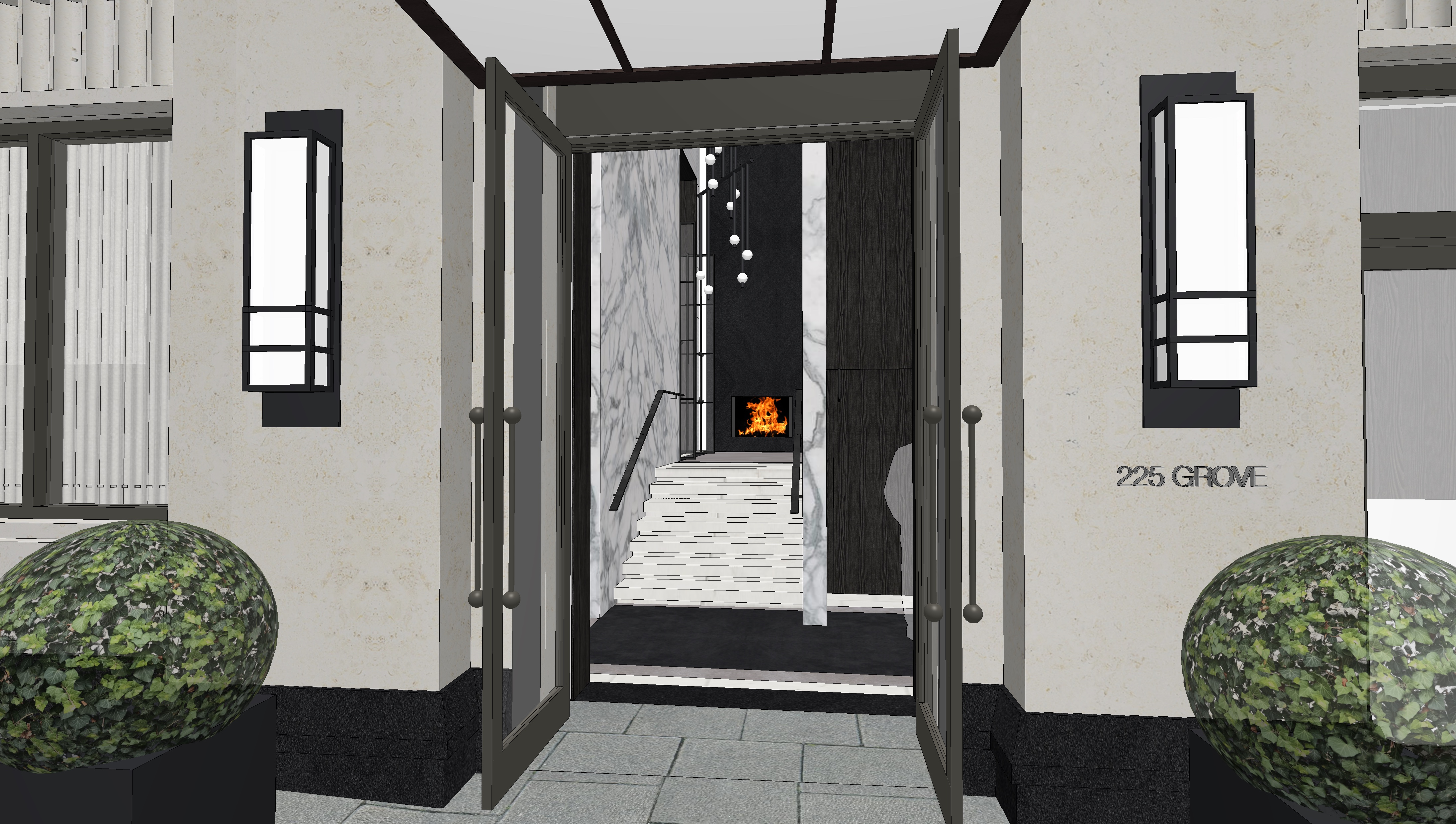 render a fully photorealistic dusk scene of this luxury residential entrance vestibule maintain the exact architectural geometry door positions fa ade proportions signage placement 225 grove stair layout marble wall panels fireplace location ceiling framing pendant lights and camera perspective do not alter materials dimensions or composition time of day early dusk soft ambient twilight glow exterior environment slightly dim but not fully night exterior lighting wall sconces both black framed wall sconces emit a warm 2700k glow light softly washes down the textured cream fa ade subtle shadow gradients above and below fixtures no overexposed hotspots signage 225 grove gently illuminated with soft grazing light letters cast subtle shadows on the fa ade refined understated luxury feel landscaping clipped round plants with natural depth and subtle highlight variation planters remain matte black with soft edge highlights entry doors threshold double doors open inward as shown interior light spills slightly onto the exterior stone pavers realistic reflections in the glass panels door hardware subtly highlighted stone pavers slightly cool toned from dusk light gentle shadow falloff toward foreground canopy metal and white glass canopy ceiling emits a warm 2700k glow interior lighting warm contrast stair marble soft linear lighting washing the marble walls veining visible with gentle contrast steps subtly illuminated from overhead downlights fireplace realistic dynamic flame warm orange glow reflecting softly onto adjacent dark wall panel slight flicker reflection on marble surfaces pendant lights glass globe pendants softly glowing warm tone 2700k 3000k subtle reflections on marble and dark wood panels interior materials marble honed finish with realistic veining dark wood panels deep espresso tone with soft sheen black flooring carpet texture rendering quality physically accurate global illumination high dynamic range exposure balanced cool exterior vs warm interior lighting subtle realistic reflections in glass and polished surfaces soft shadow gradients throughout no bloom effects no stylization ultra realistic architectural visualization 4k resolution crisp professional architectural photography style mood the space should feel inviting and refined boutique luxury residential elegant and dramatic quiet sophisticated urban entrance the final image should resemble a professionally photographed high end residential building entrance