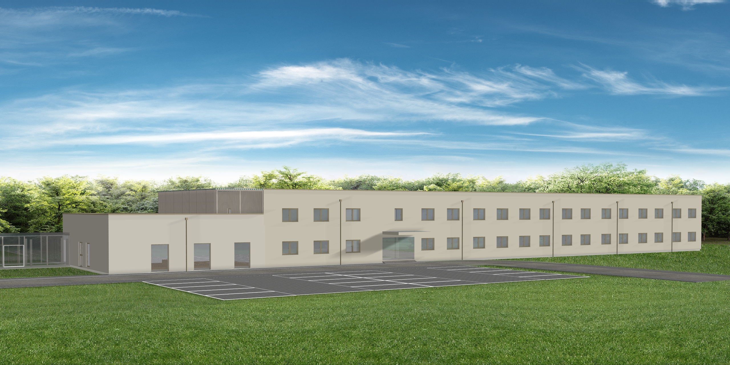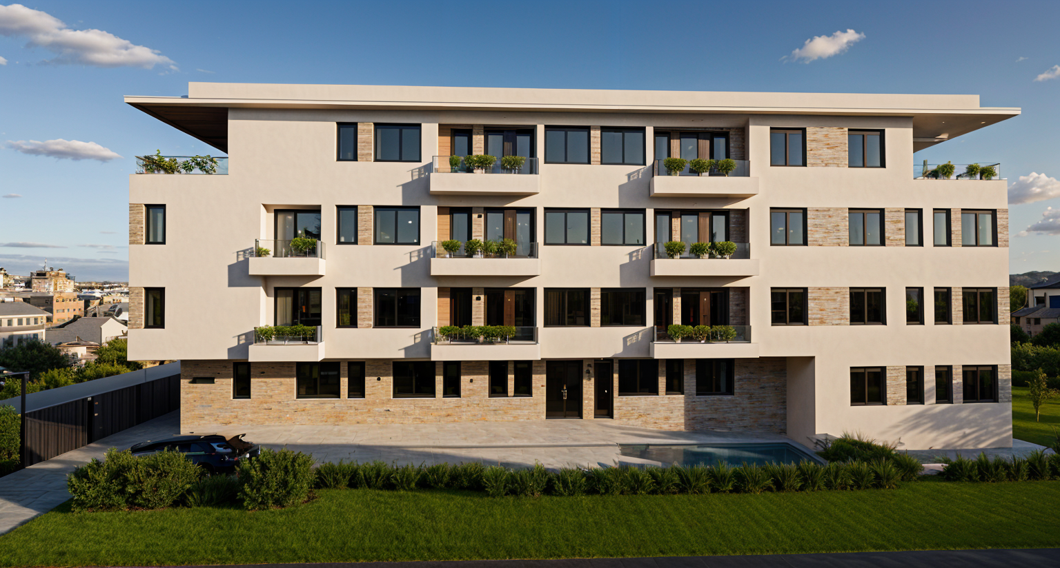 du bist architekt und proffesioneller visualisierer erstelle zu diesem geb uder welches ein hotel ist einen realistischen hintergrund bzw umgebung lasse die gesamte geb udeform unbedingt wie es im bild dargestellt ist nur die farben m ssen ge ndert werden die farbe rot wird mit einer fassadenfarbe ral 7044 und die farbe blau mit fassadenfarbe ral 7032 ge ndert die fensterfarben sind ral 7034 zu seichnen auf dem parkplatz k nnen auch vereinzelnt autos parken