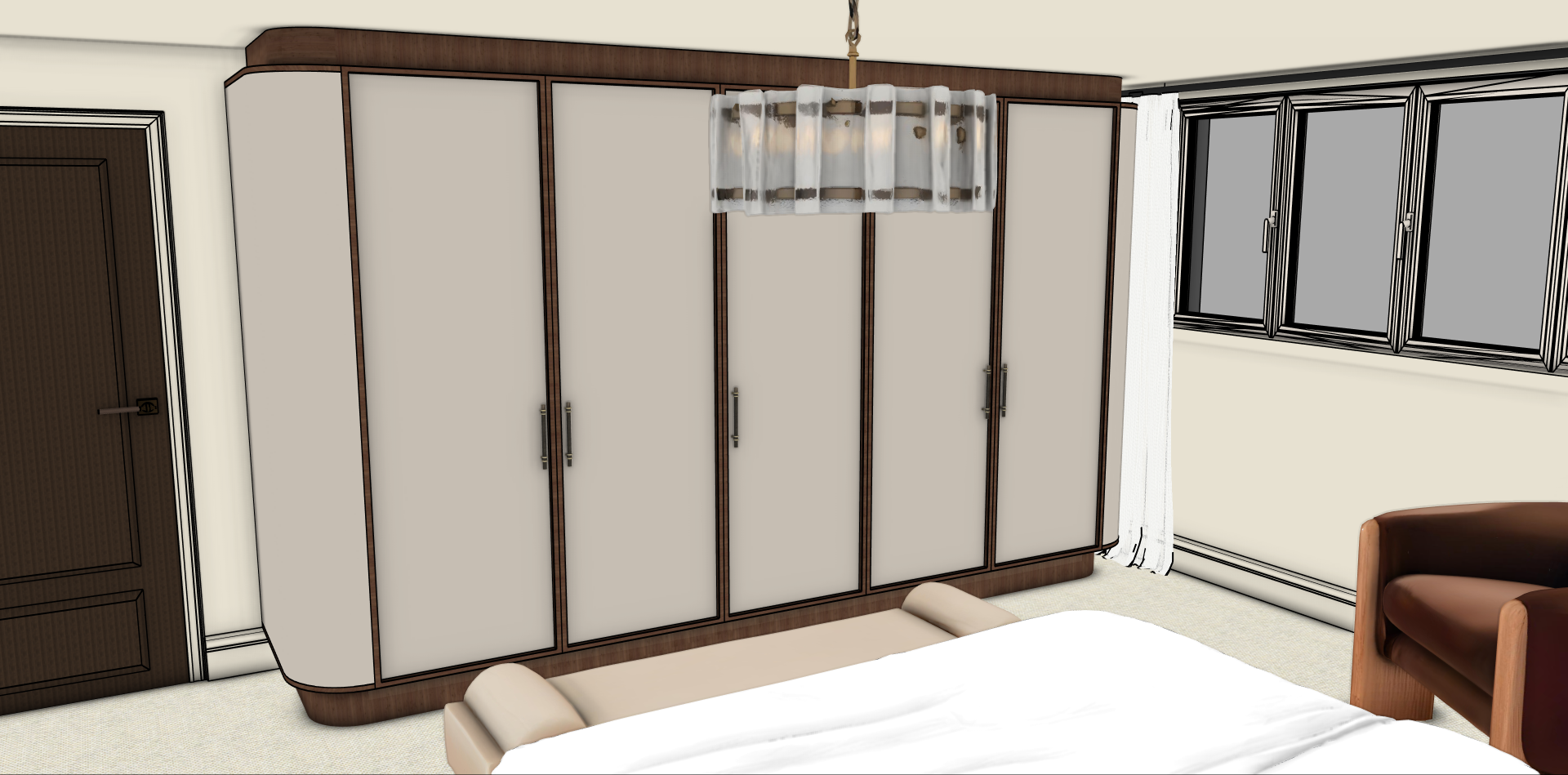 high resolution realistic image for clients natural lighting dark stained oak wood frames and plinths with painted flat wood door panels on a curved wardrobe shape windows are a warm white frame