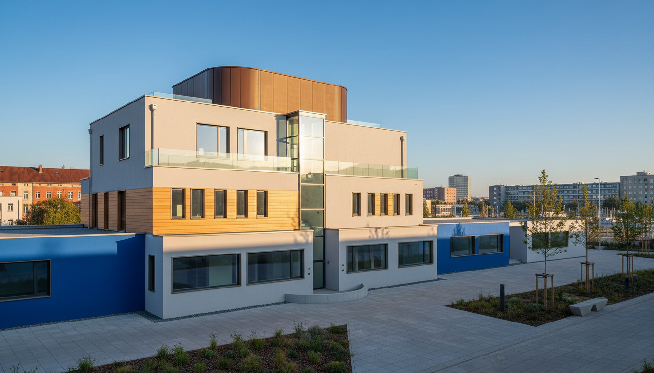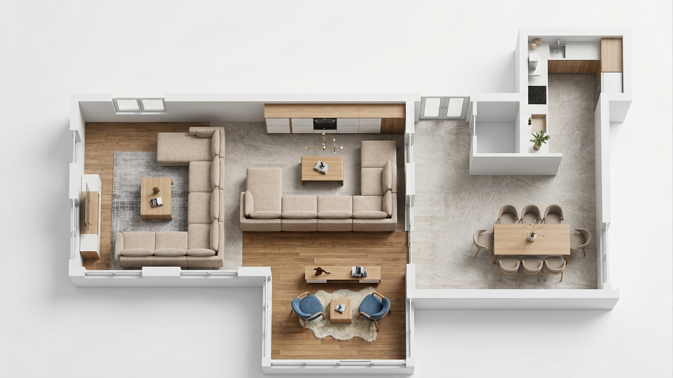 a cozy modern dining room with a warm ambiance featuring a round dark wooden table surrounded by elegant gray upholstered chairs the walls are painted in a soft taupe color complemented by the natural wooden floor above the table hangs a sophisticated bronze chandelier emitting a gentle warm glow in the background a sleek kitchen setup with light oak cabinets and a modern black countertop large windows with white blinds allow soft daylight to illuminate the room creating an inviting atmosphere