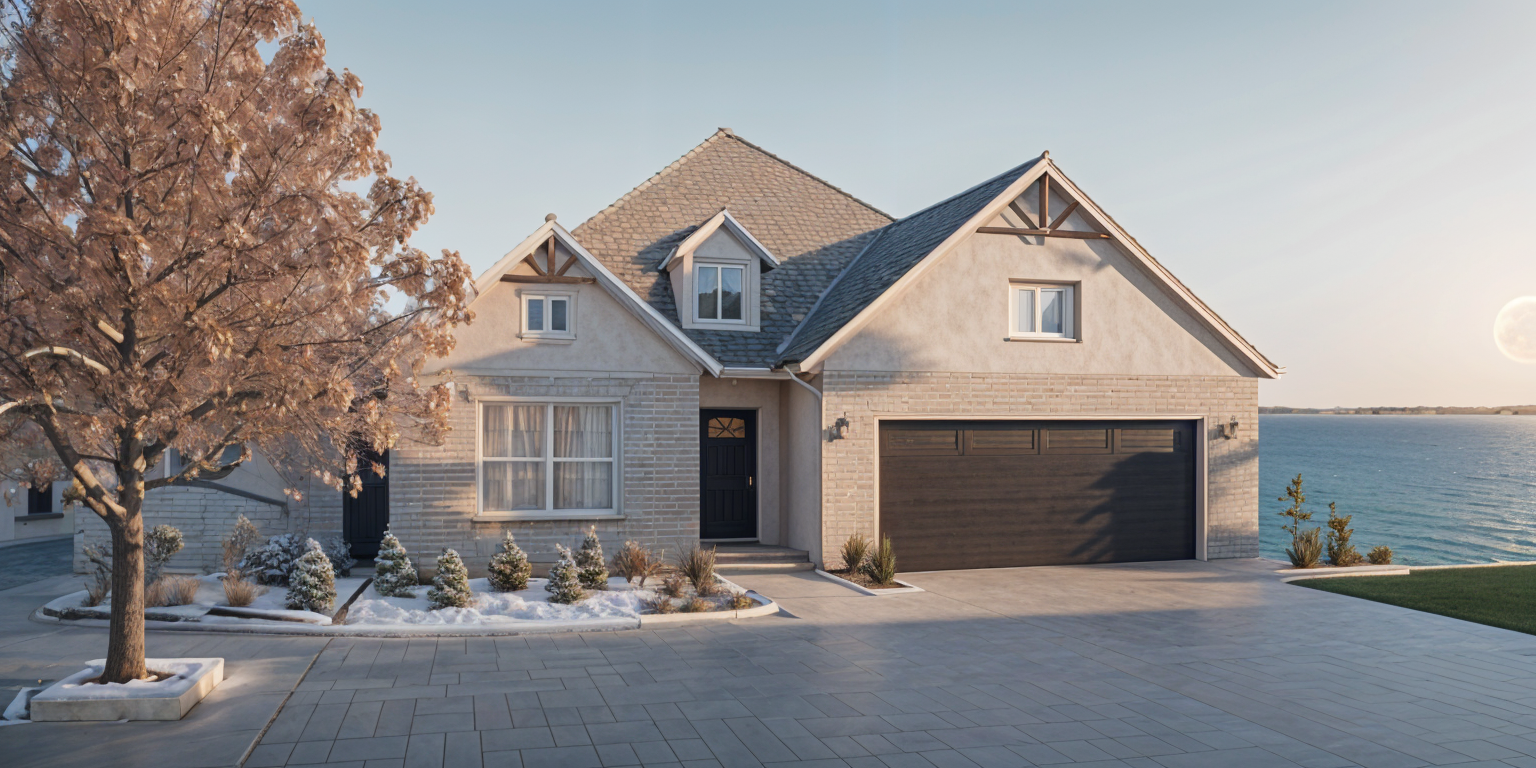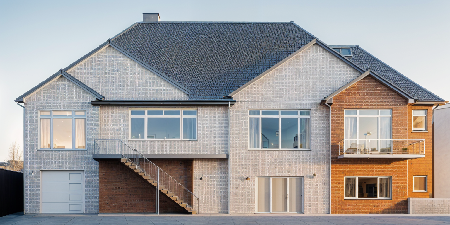 exterior shot light airy white whitewashed brick brown shingle roof black window frames architecture
