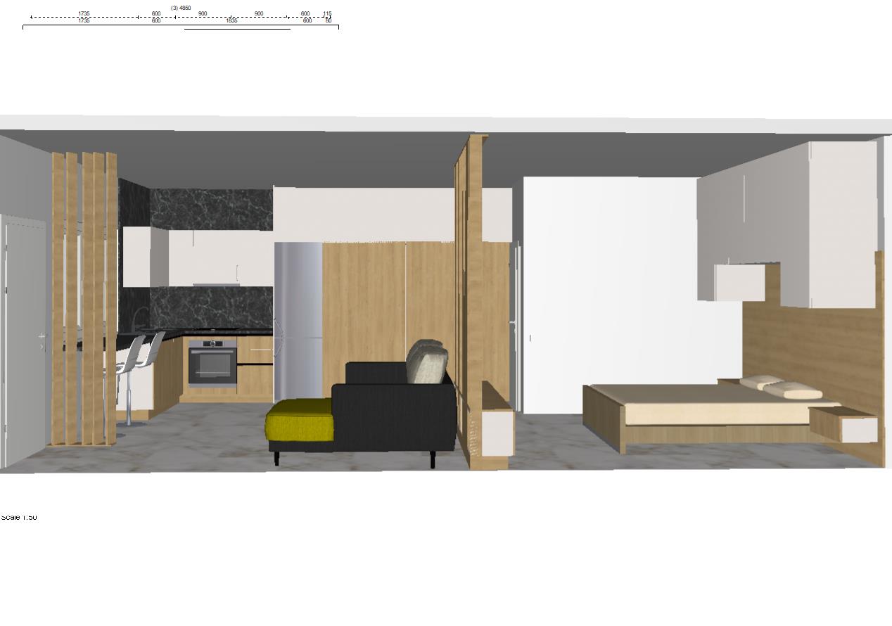 provide a modern kitchen with wooden cabinets in a warm oak finish the countertops are made of smooth light beige stone the backsplash is a subtle embossed gray color they include a stainless steel refrigerator oven and dishwasher for a sleek modern feel to the right of the refrigerator is a modern pantry with a single oak colored door the walls are painted in a soft warm beige to enhance coziness and the floor features large polished light marble tiles ambient lighting creates a welcoming and airy atmosphere and a large window on the right allows natural light to flood in highlighting the natural textures and colors