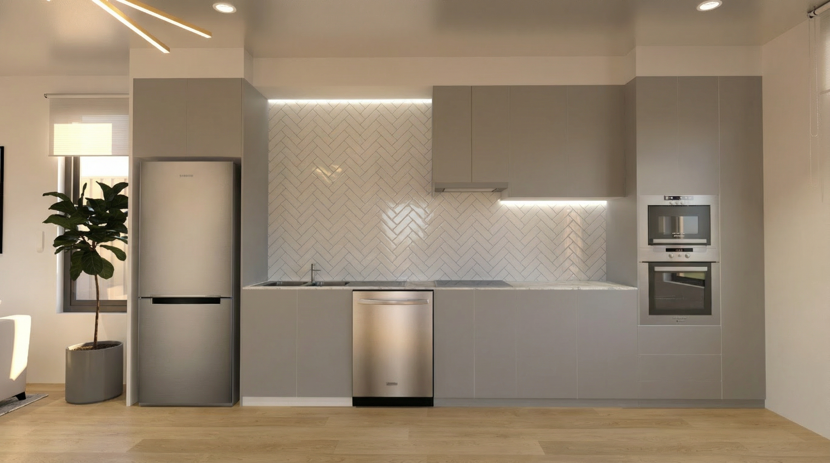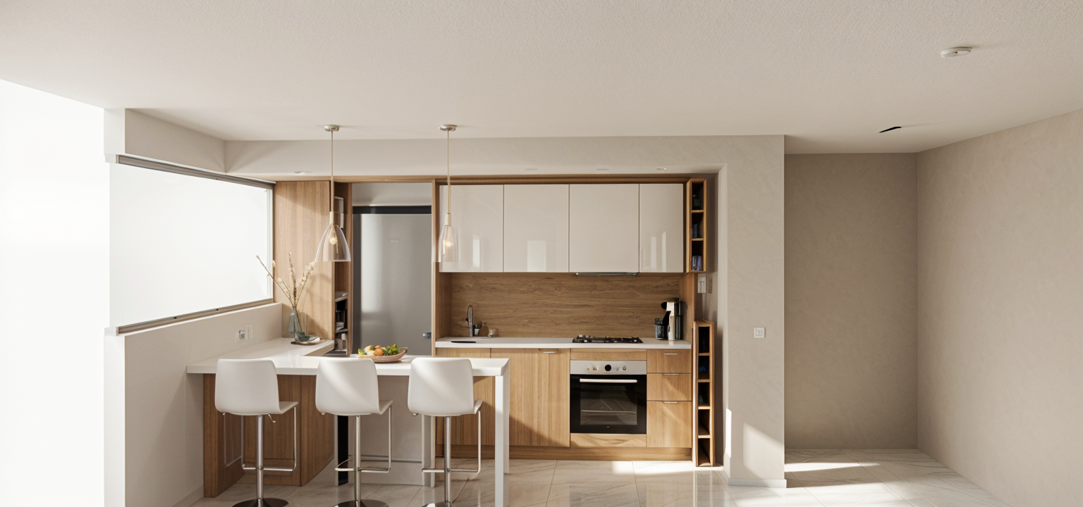 create a realistic high quality interior render with abundant natural daylight the scene should be illuminated by bright warm sunlight entering through windows the lighting should feel soft yet vibrant creating natural shadows and a fresh daytime atmosphere outside the windows include a lush green view with trees and foliage suggesting a sunny day in spring or summer the greenery should appear vivid and slightly sunlit enhancing the connection between the interior and nature the overall mood should feel airy calm and inviting with clear daylight tones and realistic light reflections on surfaces avoid artificial lighting dominance natural sunlight should be the primary light source there are built in wardrobes opposite do not change the colors or the shapes