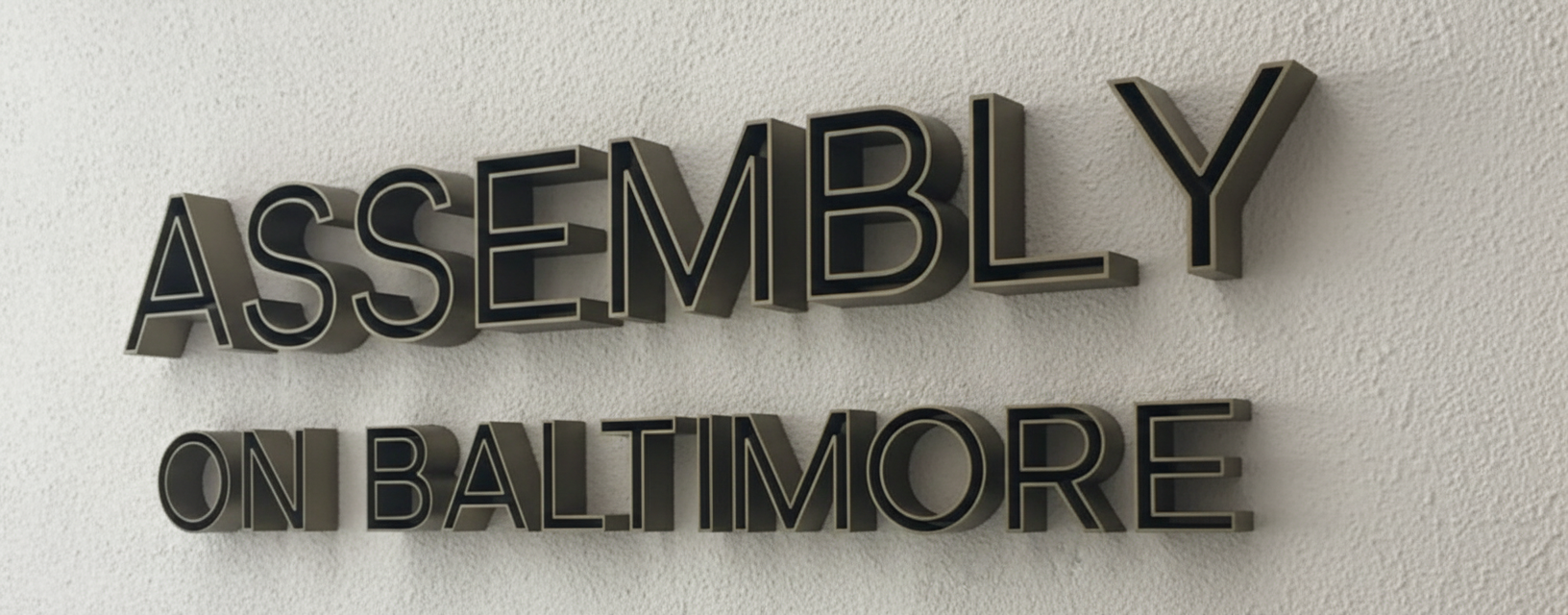 update this image to look the same in style and design but it needs to say assembly on baltimore make it 2 lines and something eye catching this is going to be an entry sign for a student housing project that is colorful and eclectic make sure this matches the vibe