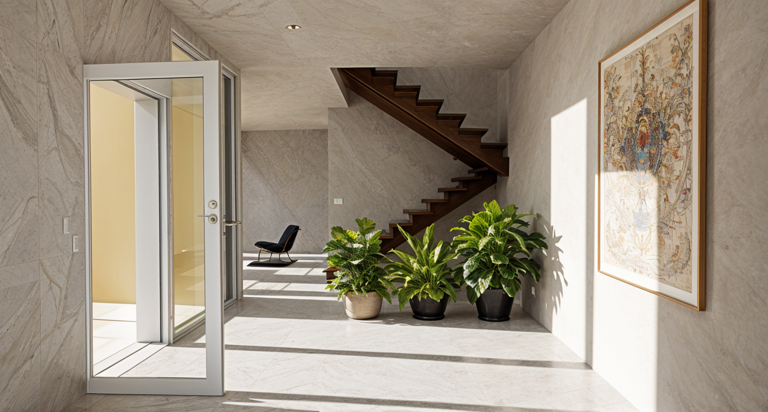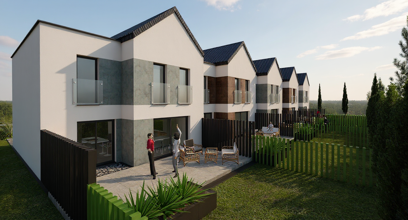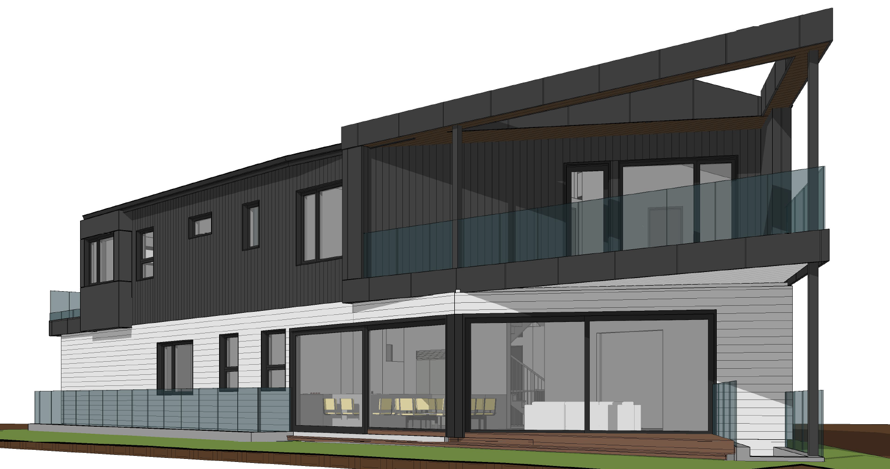 render a modern westcoast contemporary two story house with a classic design the house features white vertical siding with black window frames and a dark gray roof with oak wood soffits and accents the front porch is supported by elegant square columns add lush green grass surrounding the house for a fresh and inviting appearance the sky is clear and sunny to create a warm and welcoming atmosphere located in lush seattle the landscape of the home should be modern with many tall grasses and shrubs