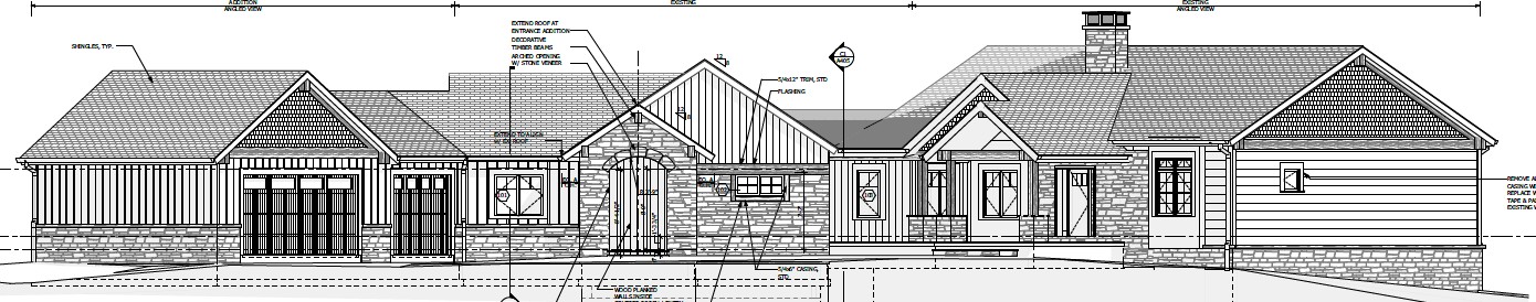 exterior shot make craftsman style with wood stone and gray green shakes and siding