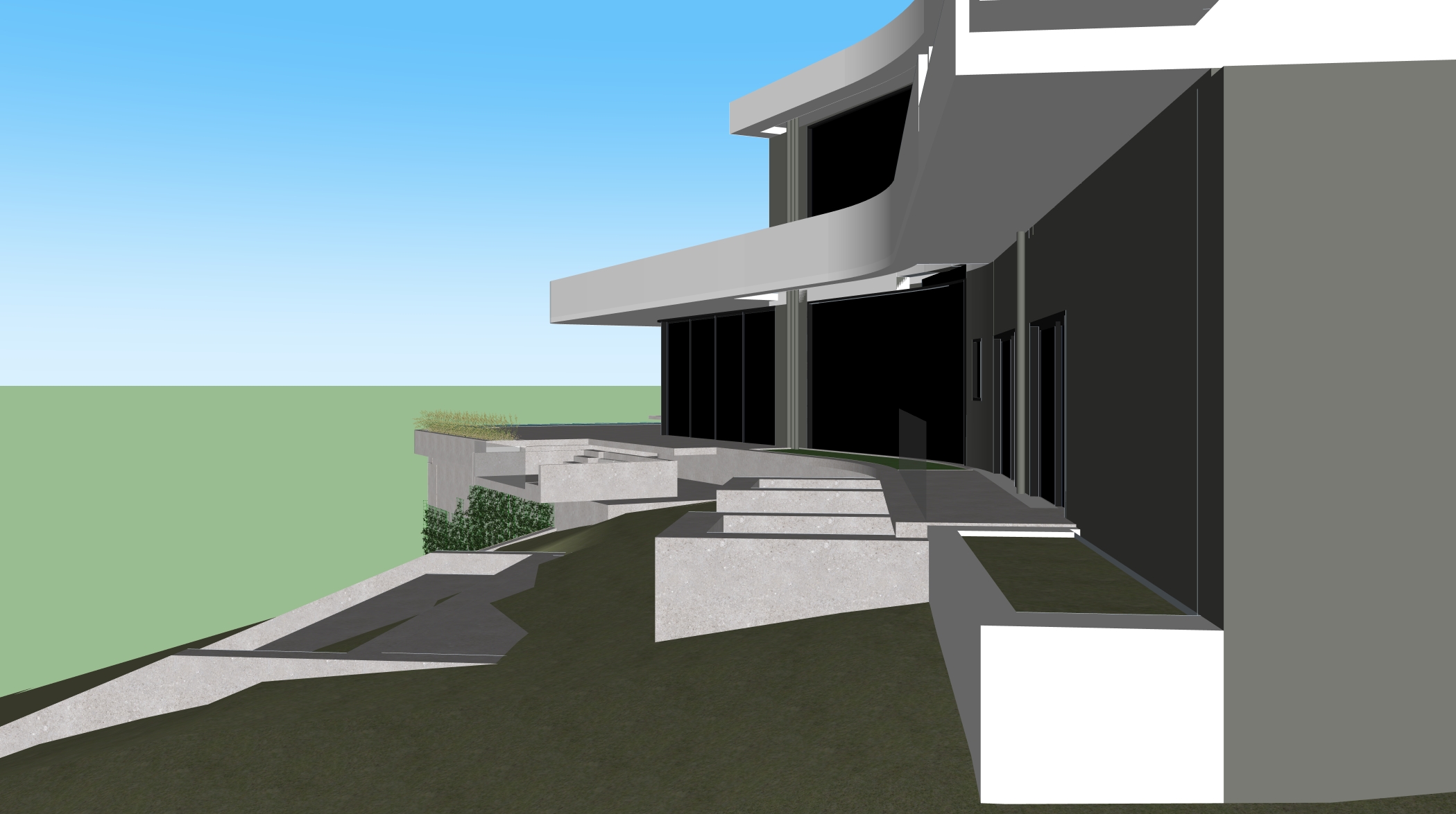 modern luxury hillside villa in tolo greece viewed from a lower eye level angle showing the entrance terraces and pool with the sea visible in the background the terrain is a smooth natural slope fully covered with green grass the landscape is continuous and natural without stepped terrain without terraces and without stone or gravel surfaces pool the swimming pool is fully embedded into the ground and integrated into the terrain no visible structural walls no exposed concrete base no infinity edge the terrain and grass continue naturally around and below the pool completely covering its base water is ultra realistic with reflections transparency soft ripples and natural light interaction architecture contemporary minimalist villa with curved and cantilevered slabs large glass fa ades warm interior lighting is on fully furnished interior visible through glass living room sofas dining table modern furniture landscape natural green lawn dominates the site a few mediterranean trees such as olive trees and cypress trees placed organically no gravel no rocks no dry landscape circulation minimal architectural steps only near the entrance clean and simple not forming terraces and not dominating the landscape view open sea view of tolo with calm blue water and horizon line visible lighting atmosphere golden hour sunset warm luxurious lighting cinematic sky soft shadows high end luxury villa atmosphere elegant and calm materials exposed concrete white plaster natural stone only on the building large glass panels style photorealistic ultra detailed architectural visualization real estate quality render global illumination