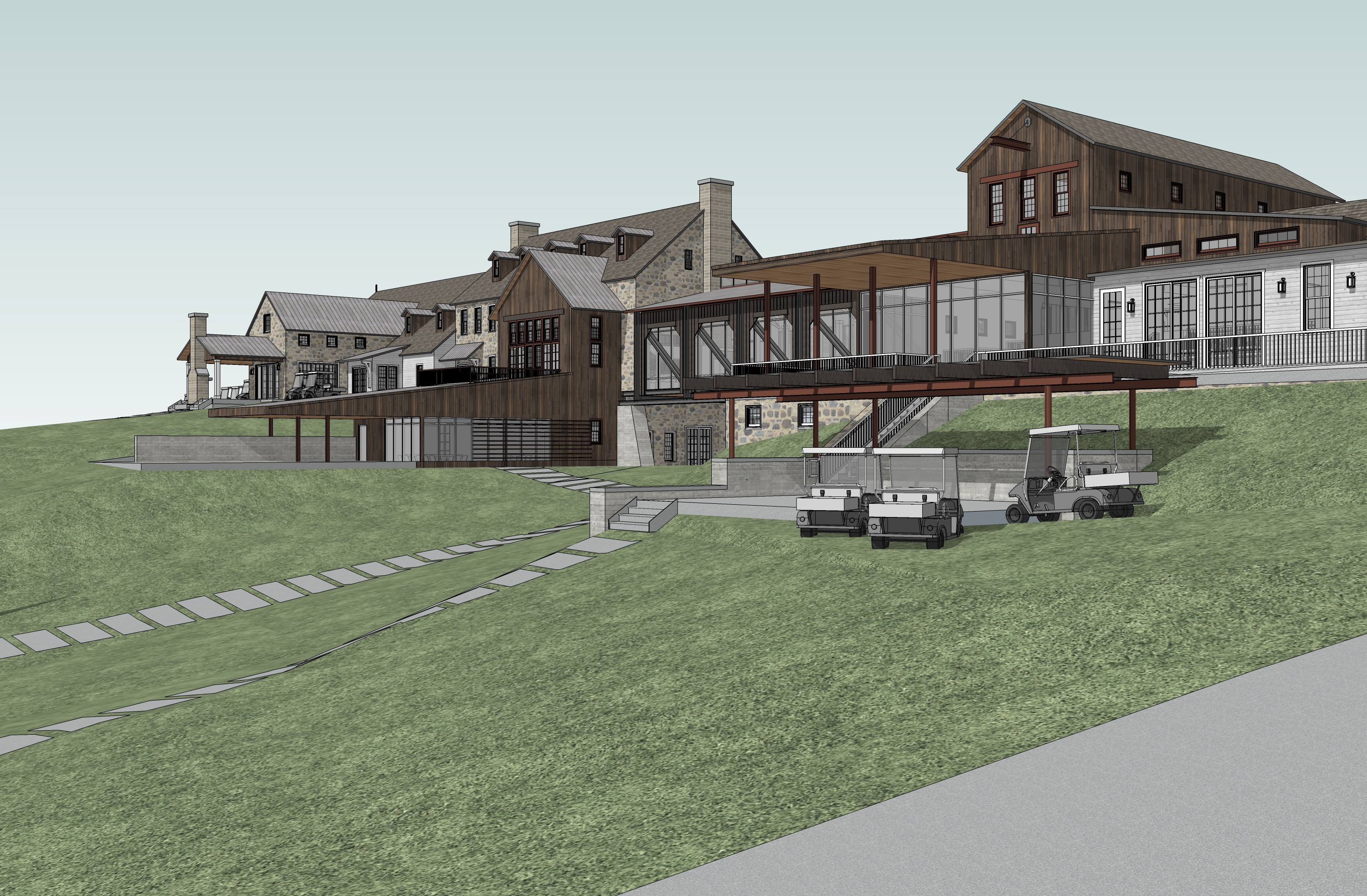 industrial design mill house with vertical matte wood shiplap steel bridge with wood slats old stone farmhouse with carriage house attached tall grass foreground trees in background sunlight on building face fog small creek running under bridge