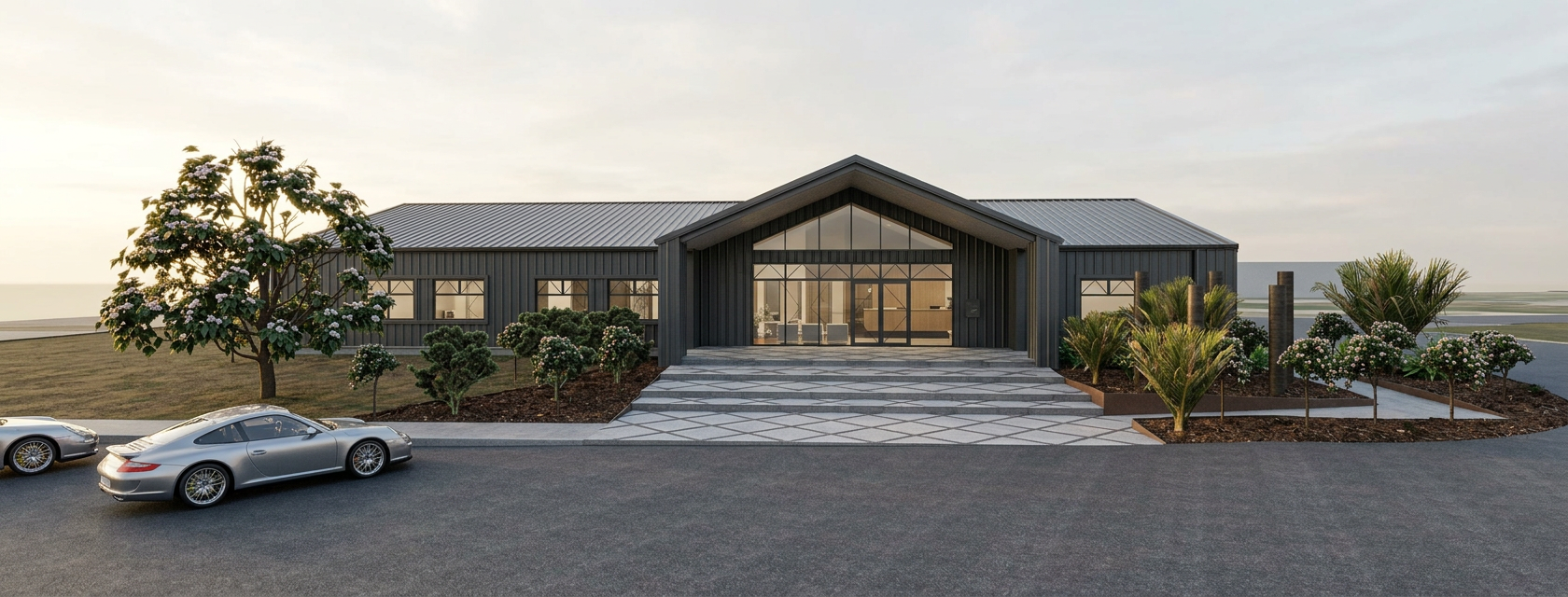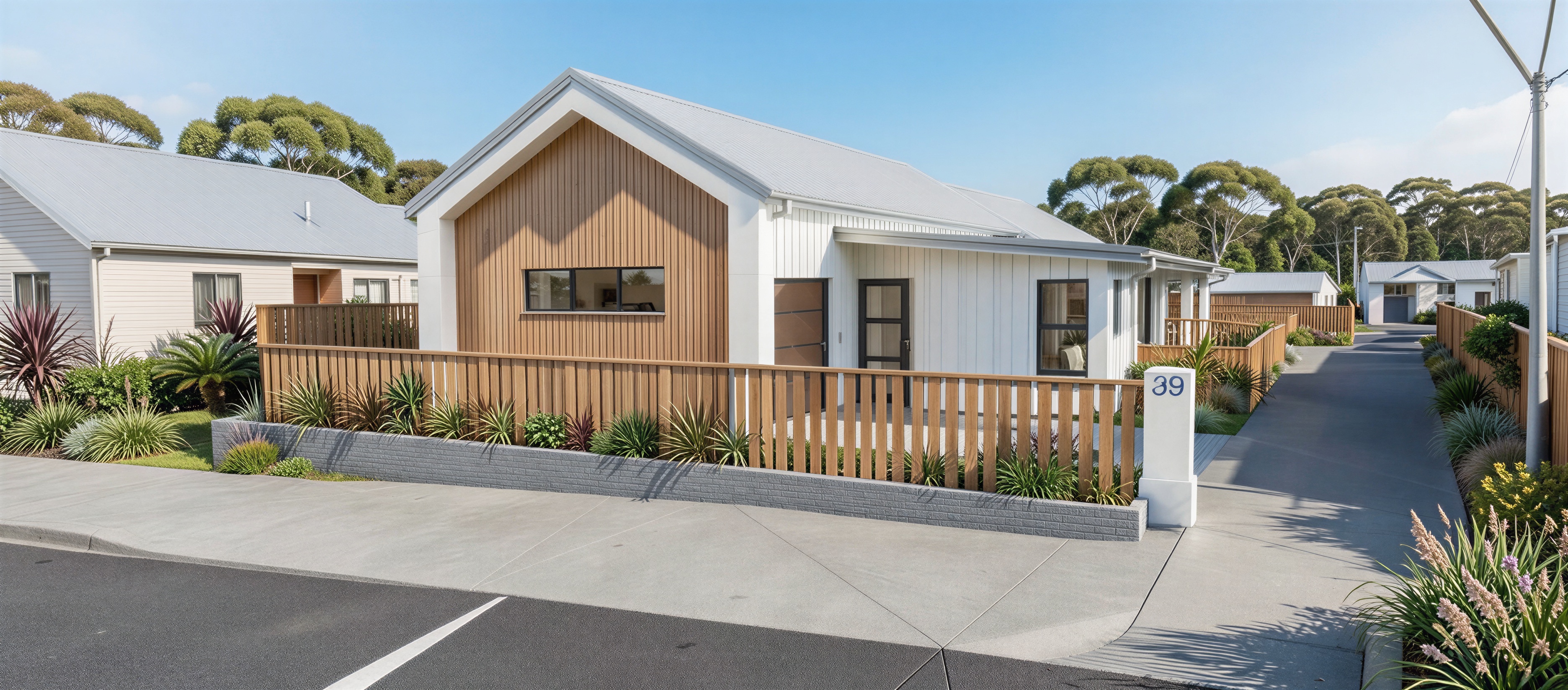 render a photorealistic 3d perspective of this house in a northland new zealand reference the current material style just enhance them light grey standing seam metal roof walls keep model windows doors roof walls geometry the same feature vertical timber sidings under gable in front door recess in medium wood colour light white weatherboards make a environment for town houses on a street view do not change the view only enhance the current materials and make the landscape nicer vegetation detailed textures and glass reflections add a vibrant clear sky with light atmospheric depth render in hyper realistic architectural visualization quality 8k resolution houses behind in the distance trees behind around house remove lines in ground mesh smooth ground road in front of house with kerb
