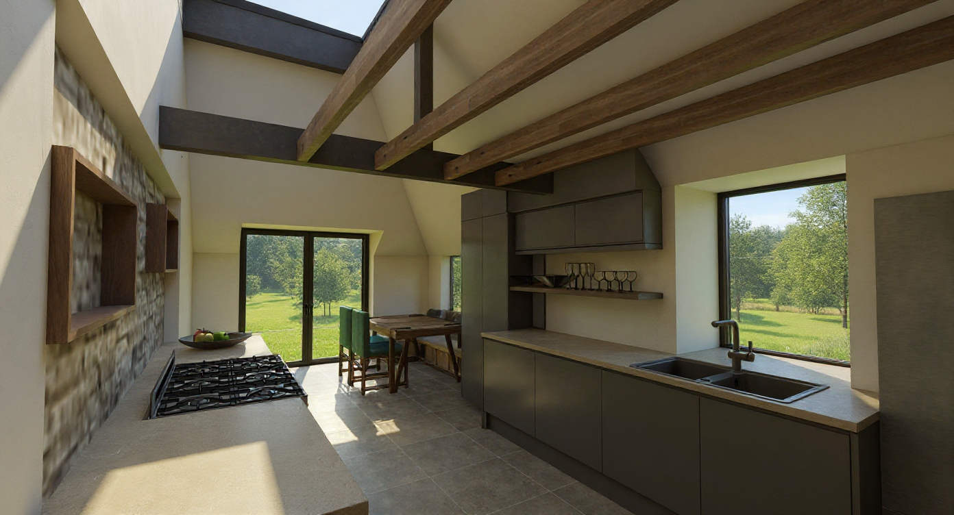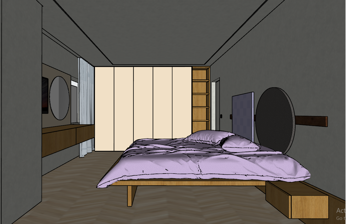 hyperrealistic image scandinavian minimalist style wall and ceiling from white beige limewash floor from white oak chevron hardwood bed sheets from white linen wood elements from natural oak veneer on the left rectangular tv and circular mirror