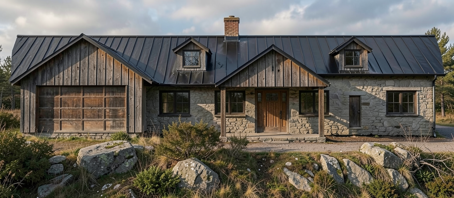 photorealistic rendering set in canada lake in distance behind house keep all geometry as per image provided roof black shingles siding is white roof above front door is a flat roof with metal fascia add vegetation local to canada