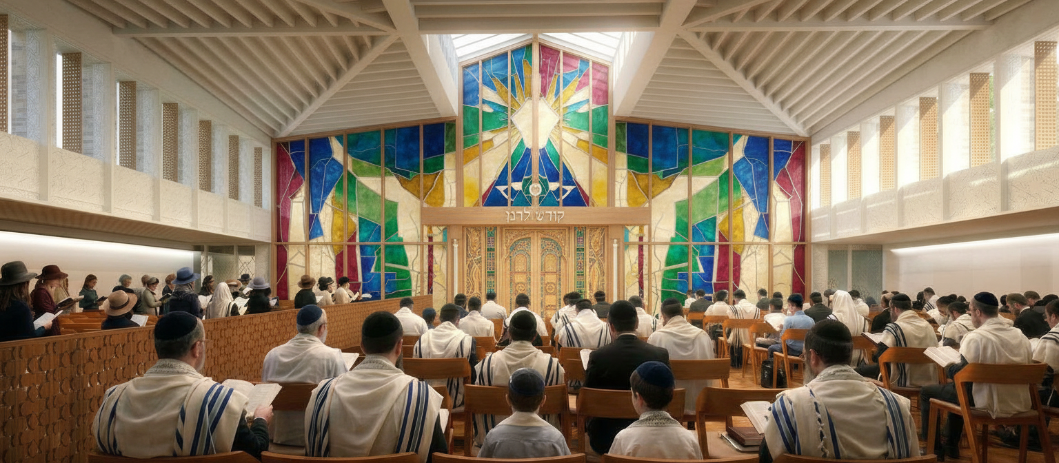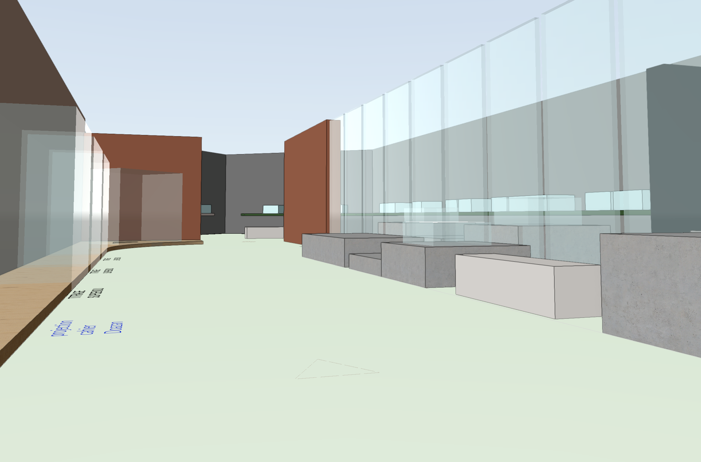 create an overhead view of a minimalist exhbition interior space the floor is a sleek medium gray concrete providing a neutral base the walls are a soft gray tone contrasting subtly with the warm light wood trims include angular geometric glass structures in a muted gray blue adding contemporary elegance on the left side highlight long cushioned benches in bright red providing a pop of vibrant color windows and other fixtures are detailed with pale blue glass for a calming effect the overall atmosphere should be minimalistic clean and inviting with soft ambient lighting accentuating the balance between warm wood and cool gray tones