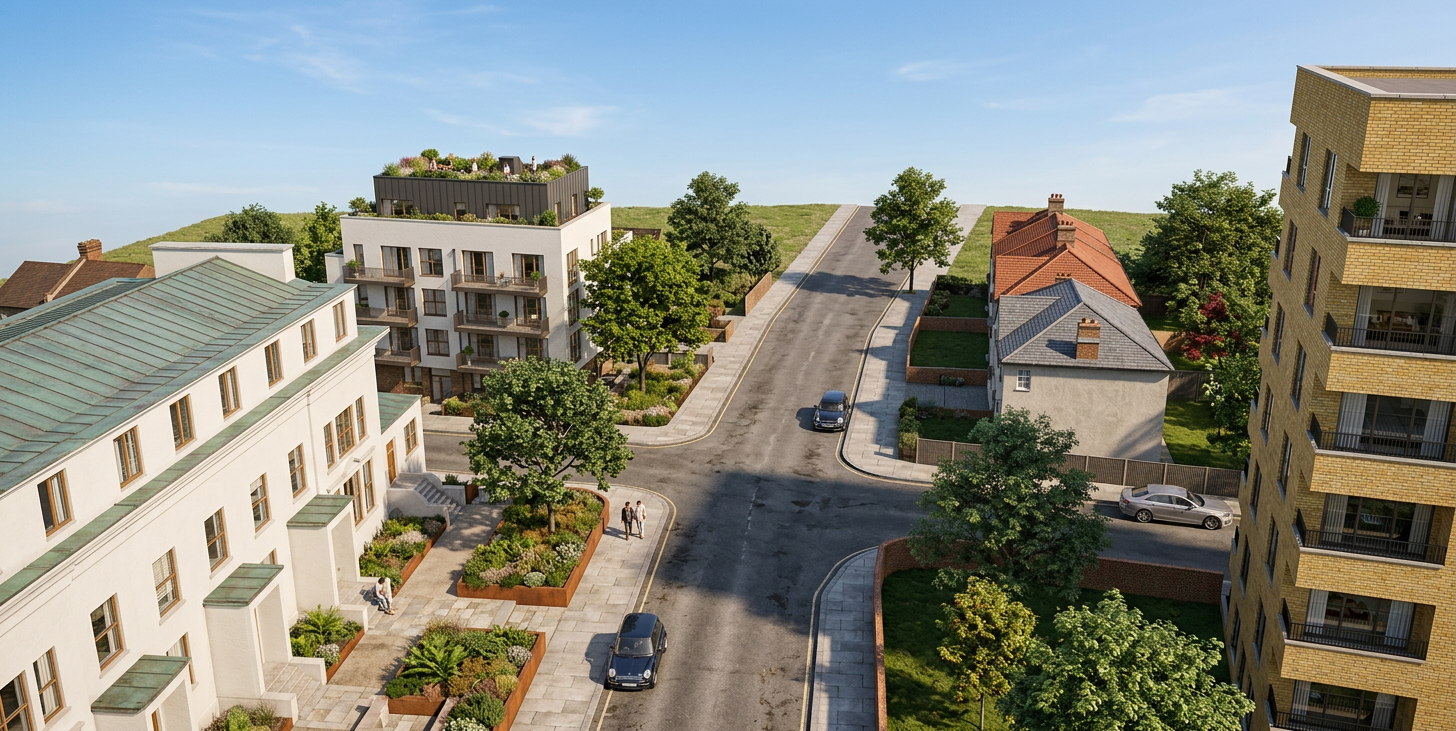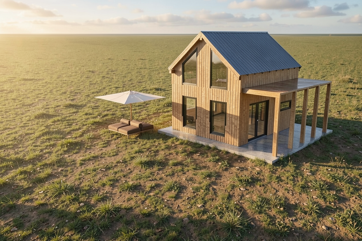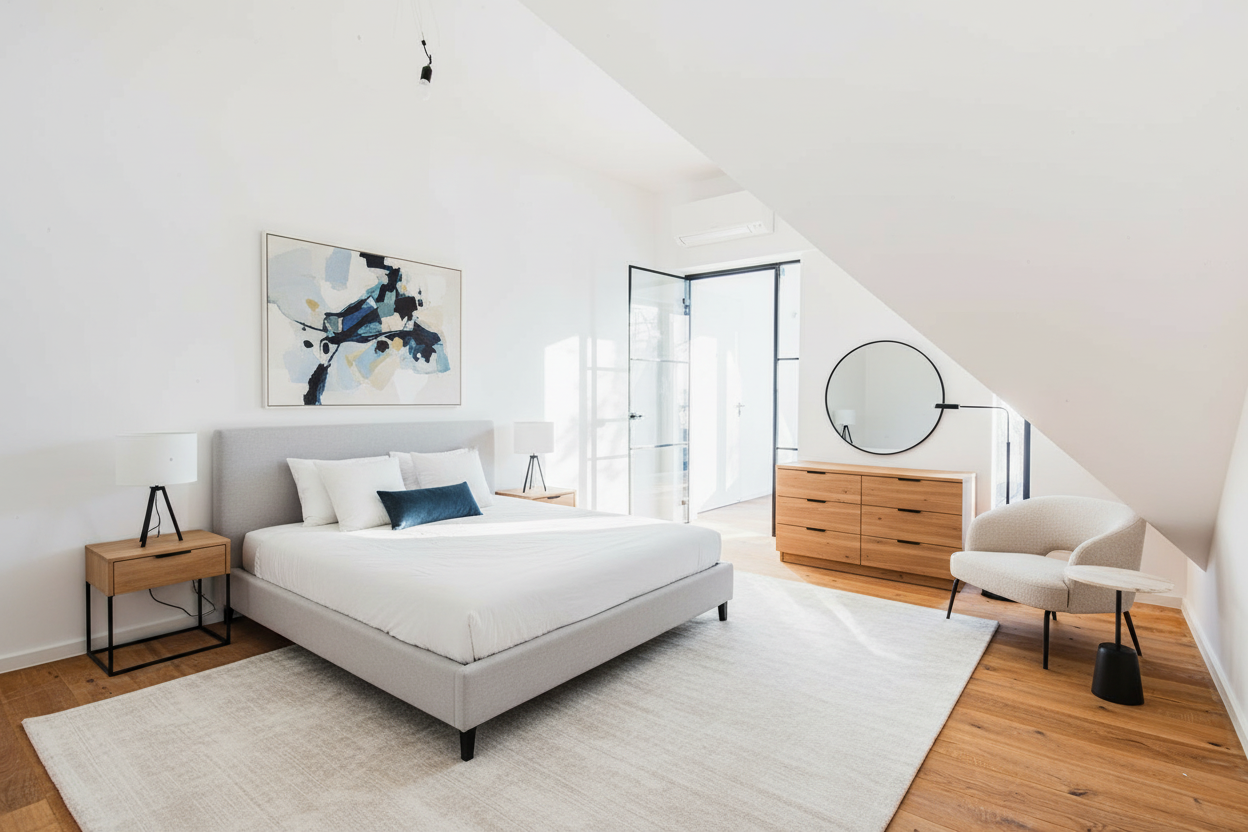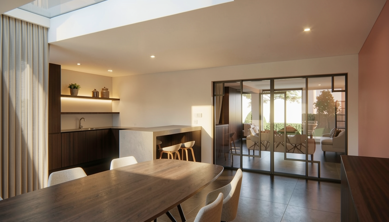 create a realistic cozy suburban house scene with a two story house featuring a light gray exterior with crisp white trim the front door is light red adding an inviting touch all windows are framed with black shutters and a subtle grid pattern at the windows the roof is a gentle black shingle contrasting harmoniously with the rest of the facade surround the house with a tranquil lush green lawn under a crisp clear blue sky casting soft natural shadows to enhance the serene atmosphere add trees in the background no garage door but three tall casement windows create a sunroom on the left where a garage door is shown