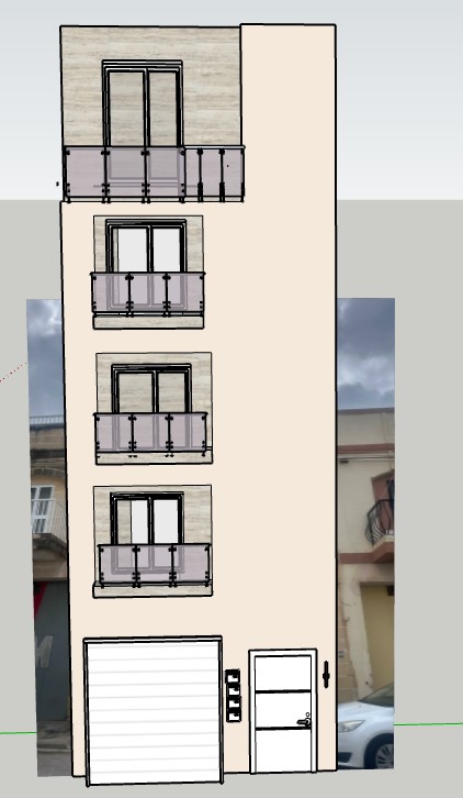 ultra realistic architectural render of the provided sketchup facade this is an image to image enhancement strictly preserve the exact front elevation view camera position proportions and composition do not change angle perspective framing or geometry in any way material distribution must follow model exactly main facade surfaces smooth painted masonry rendered plaster in a warm sand beige tone travertine stone cladding applied to balcony feature zones including the wall surfaces directly behind each balcony recessed areas the horizontal slab elements underside and front edge of balconies facade finish sand beige clean uniform matte smooth refined plaster very subtle fine grain only no stone texture no aging no stains no cracks travertine balcony zones light beige travertine tile soft horizontal veining honed matte finish large format tiles with subtle joints clean and refined not rough important travertine must appear only in balcony zones back walls slab elements no travertine on the main vertical facade mass maintain sharp clean transitions between plaster and stone balcony railings clear glass balustrades minimal metal framing realistic transparency and reflections apertures window and door frames in crisp white lighting natural mediterranean daylight soft shadows balanced exposure context maintain surrounding buildings exactly as in the original image no redesign or reinterpretation rendering style high end photorealistic architectural visualization clean modern newly built strict constraints no camera movement no perspective change no material reinterpretation no material bleeding between zones important treat the input image as fixed and only enhance materials and realism