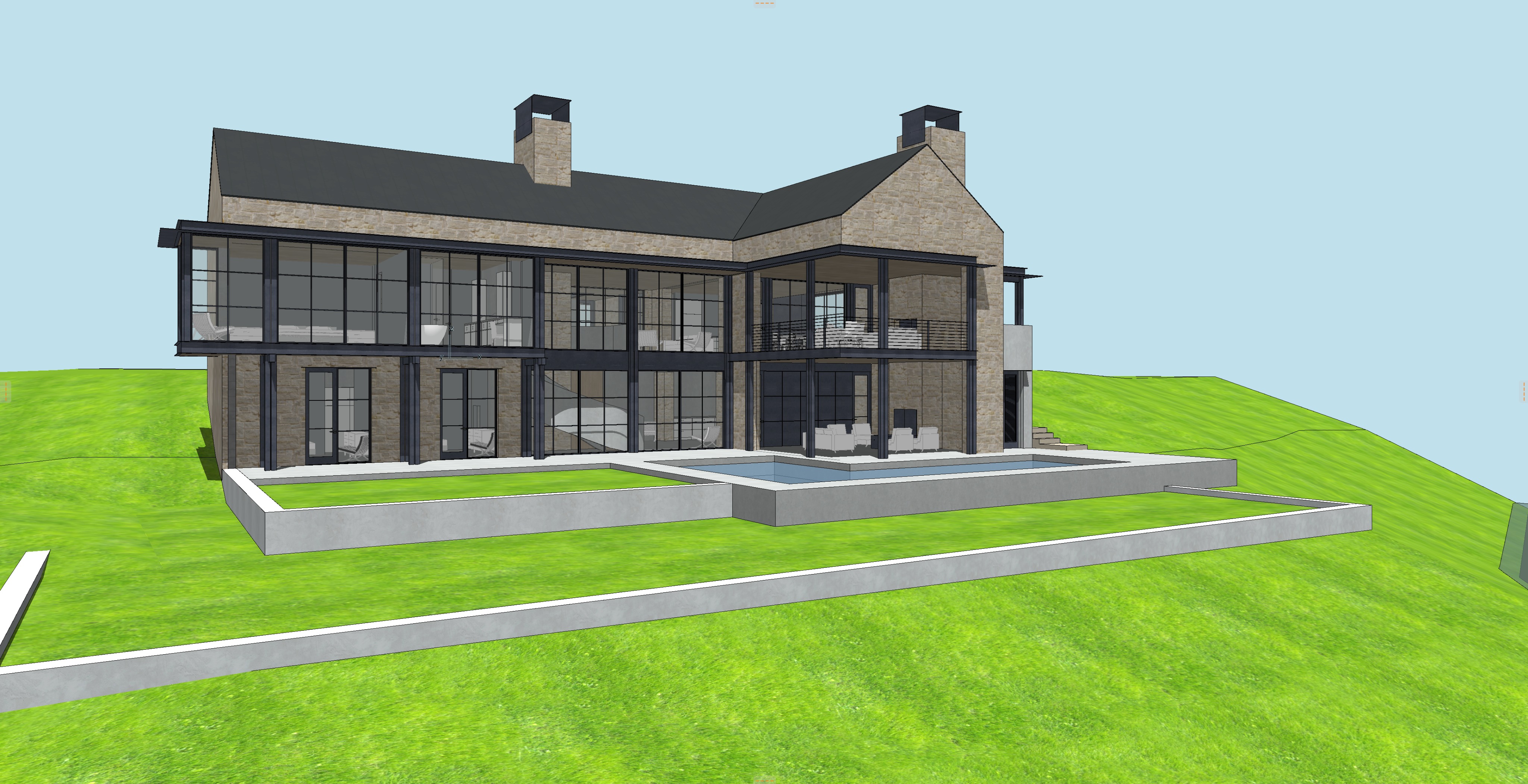 light grey limestone with rough grout standing seam black metal roof southern us location add trees and minimal landscape no tree reflection in windows