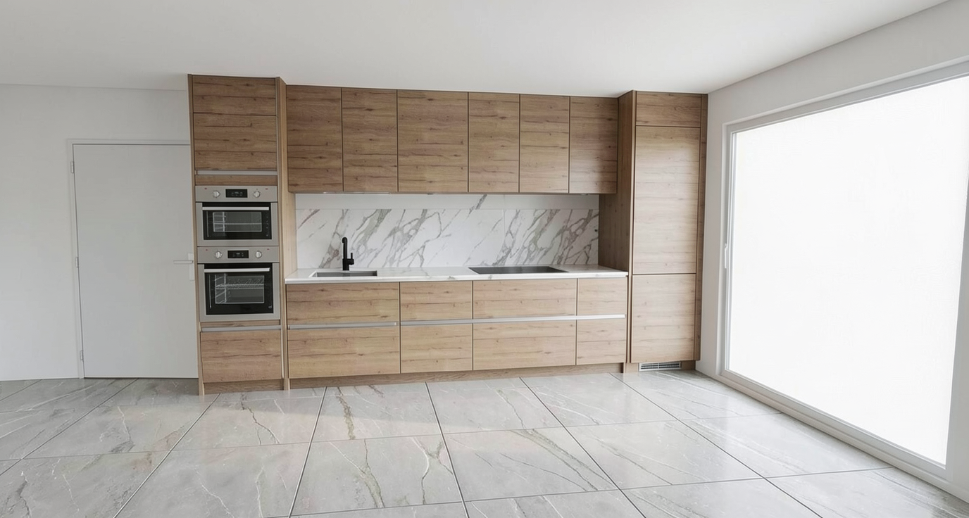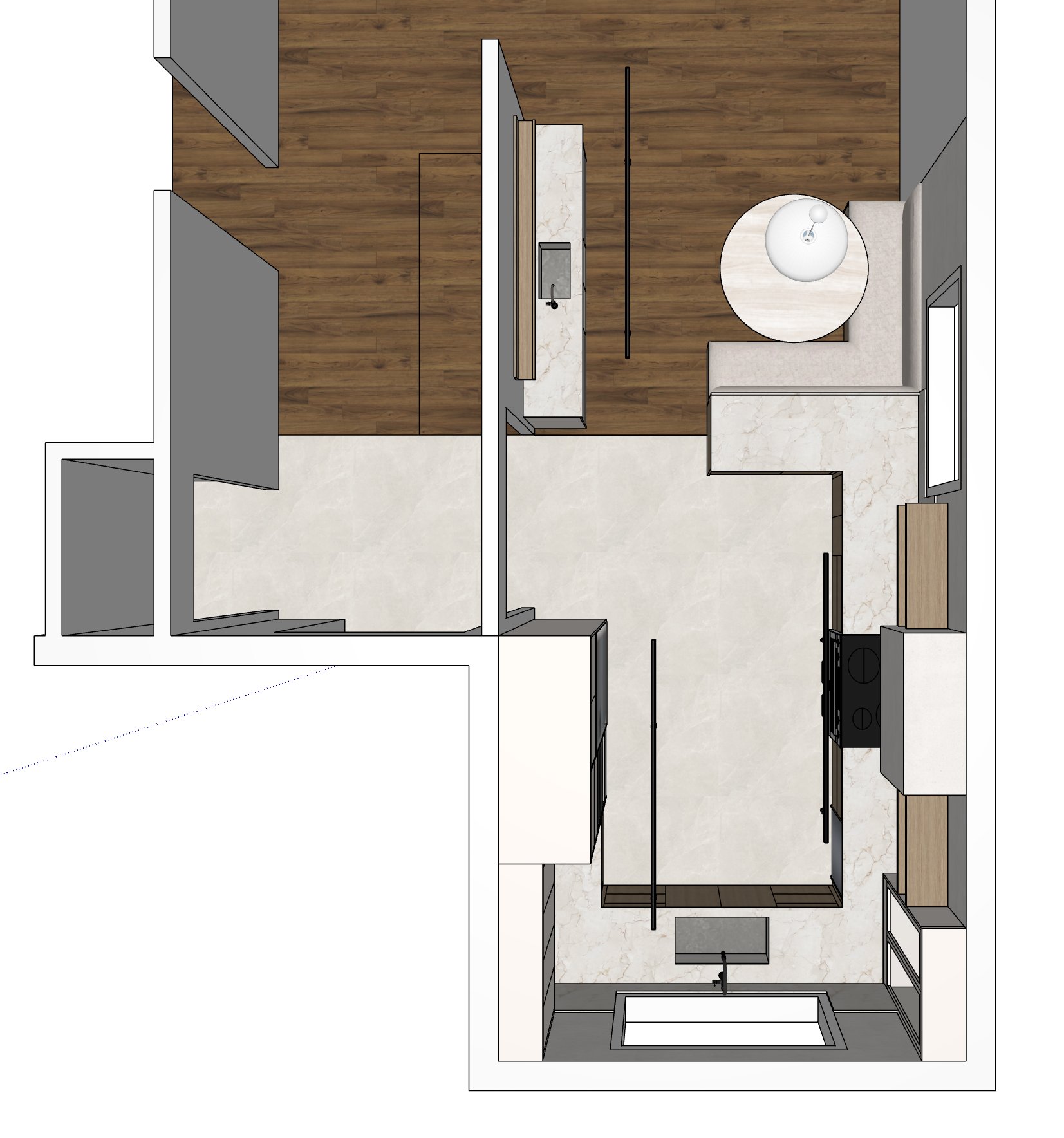 maintain model maintain colour render a top down view of a japandi modern interior layout with rich textures use warm brown oak wood for the flooring in the living areas complemented by soft creamy beige tiles in the kitchen and hallway the countertops should have a soft creamy beige texture with subtle veining in off white tones illuminate the space with soft natural light creating a cozy and inviting atmosphere