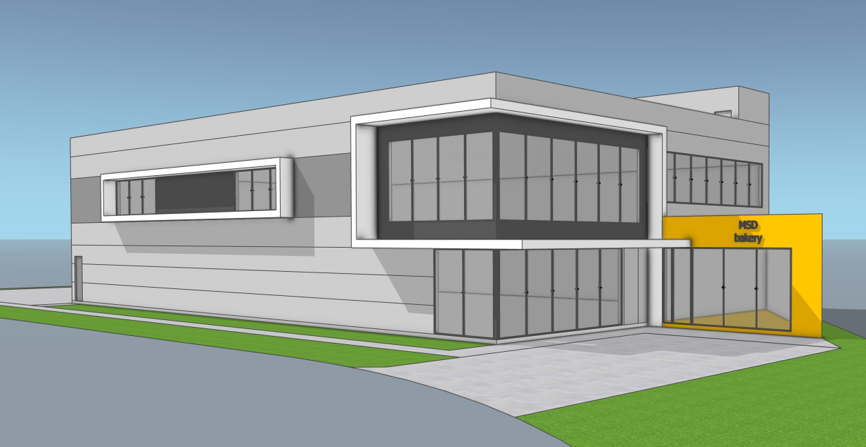 render a modern two story bakery building with a sleek minimalist design the facade features smooth gray concrete with large glass windows framed in white allowing natural light to flood the interior a striking yellow accent wall on the side with bold black lettering identifying the building as bakery adds a pop of color the atmosphere is bright and inviting with a clear blue sky overhead enhancing the building s contemporary aesthetics lush green grass surrounds the structure providing a fresh and welcoming environment the overall mood is modern clean and welcoming with an emphasis on architectural elegance and functional design