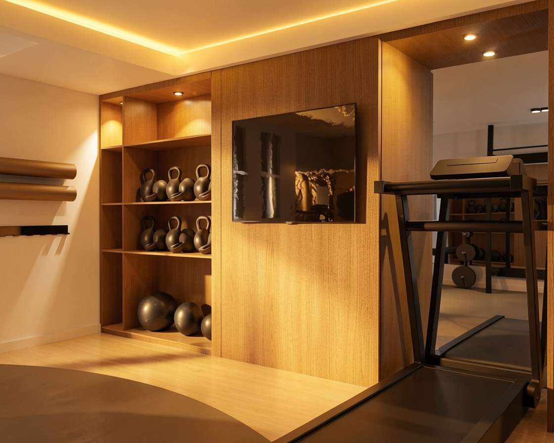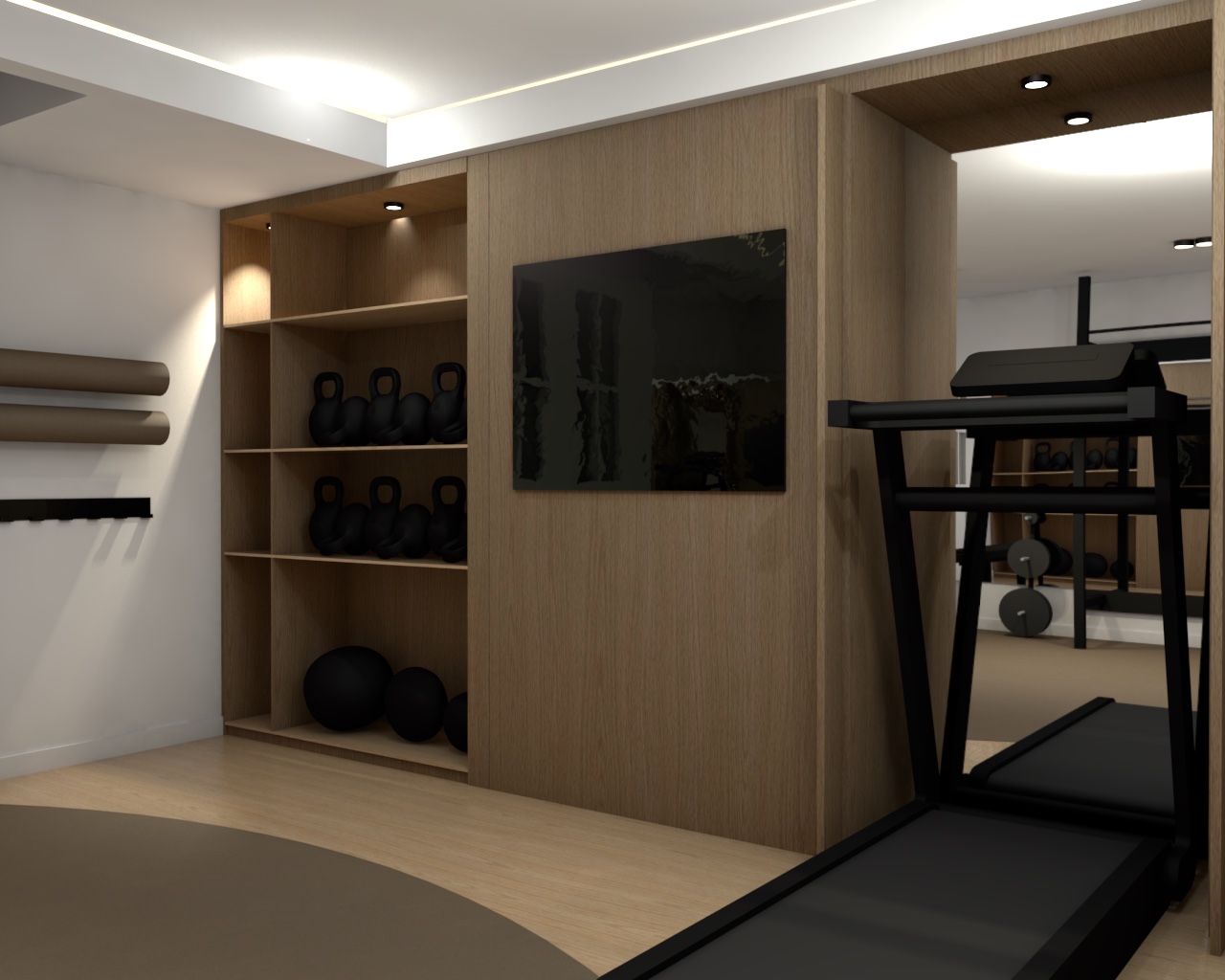 ajoute des lastiques de fitness beige sur le support mural noir qui se trouve sur les tapis au mur