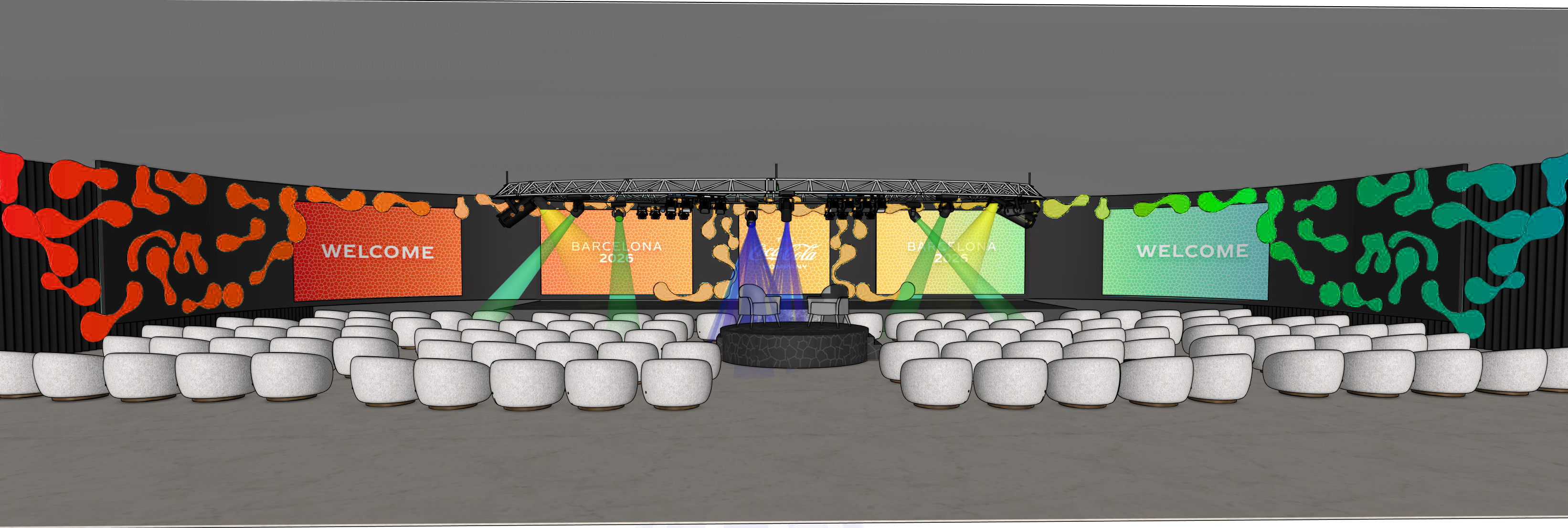 render a modern conference hall with vibrant lighting and colorful abstract designs on the walls use a combination of bright orange green and blue for the abstract patterns on a matte black background the stage features a sleek metallic structure with spotlights casting beams of green blue and yellow light across the room rows of stylish gray upholstered chairs are arranged in a semi circle facing the stage the atmosphere is energetic and welcoming with a backdrop featuring welcome and barcelona 2025 in bold white text on warm orange and green panels the floor is a polished light gray stone