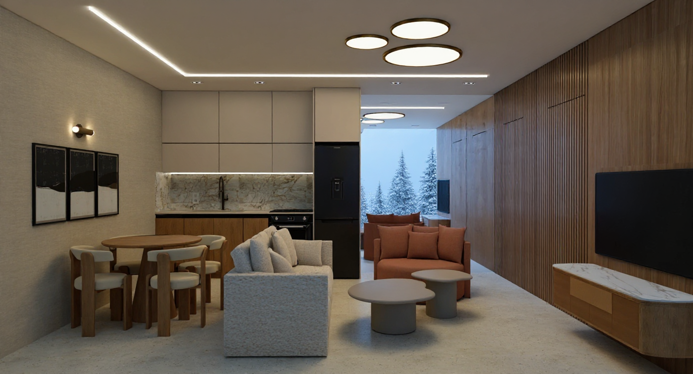 create a high definition photorealistic 3d render do not change the materials use artificial lighting with a color temperature of 3000k include a city center view visible through the glass in the background the materials text and furnishings must remain exactly in their original positions and proportions but appear more realistic place a person sitting on the chair