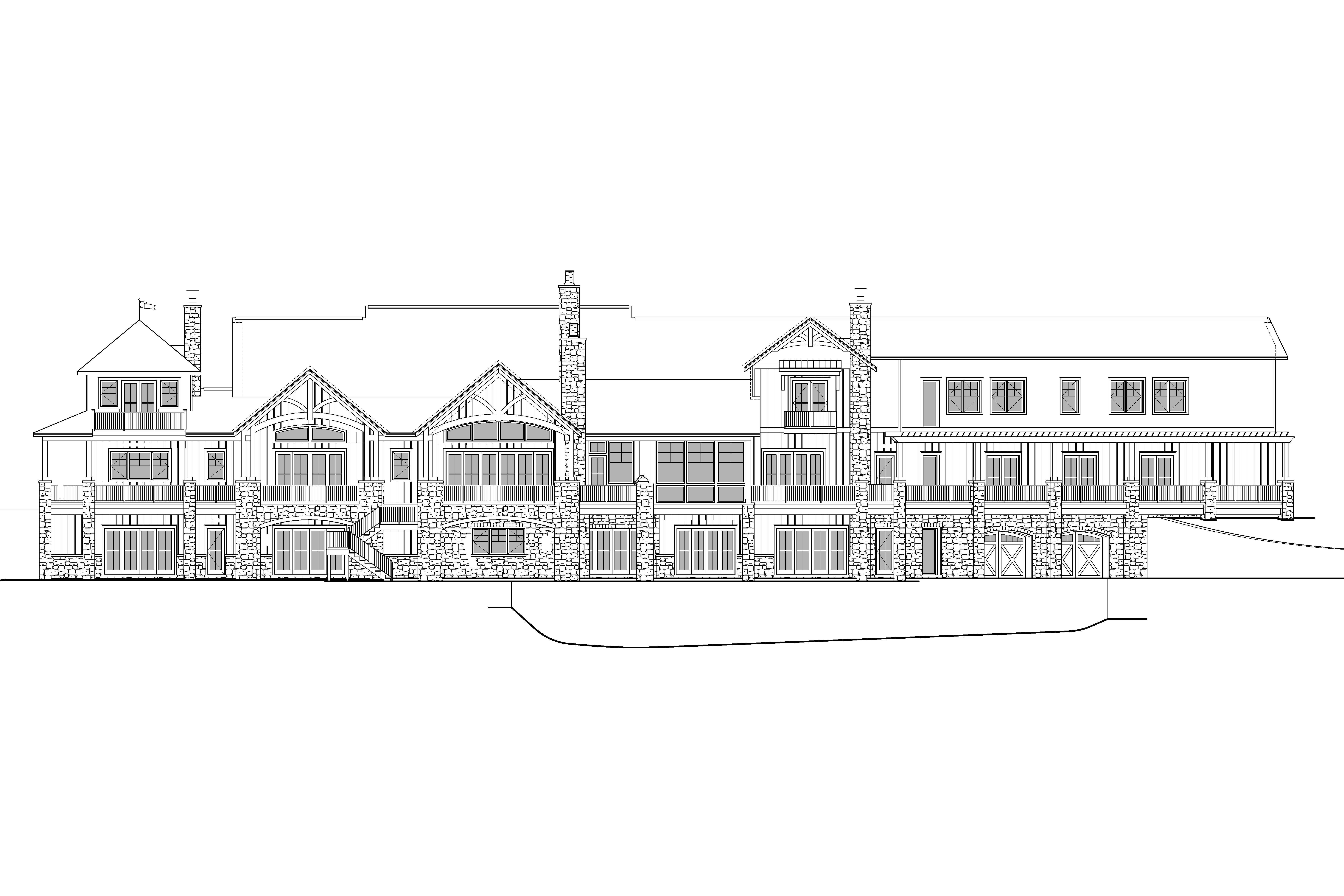 render a photorealistic 3d perspective of this house it should be a nice sunny day with a blue sky and some clouds the materials and finish of the house should give the feel of a lodge there should be many trees and lush vegetation