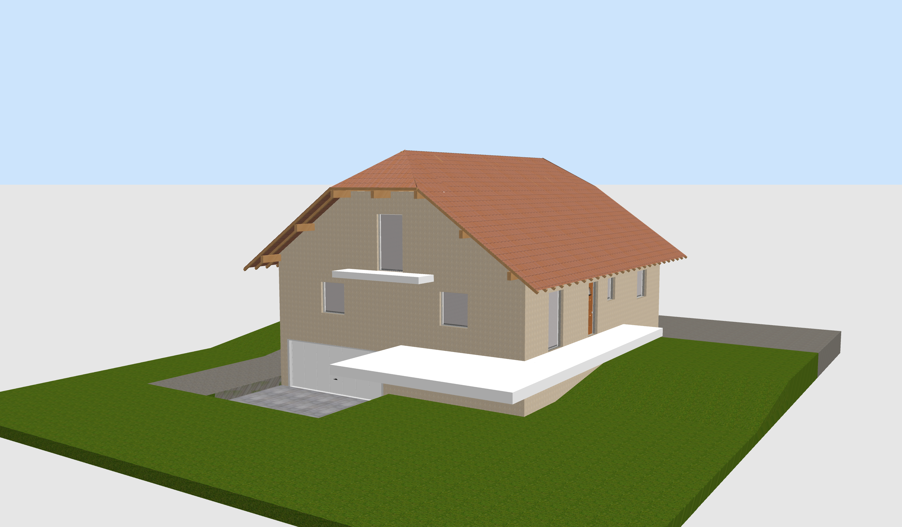 maison dans un lotissement avec la route qui passe derri re la maison l acc s au garage se fait en pensant par l arri re de la maison pour rejoindre l entr e du garage qui est sur l avant maison avec un cr pi blanc cass et des menuiserie couleur noir sabl les balcons sont en bois et celui du bas est sur pilotis la maison est enti rement r nov e les fa ades sont clean et elle a t modernis e pour correspondre aux design contemporain a l avant de la maison il y a un jardin arbor