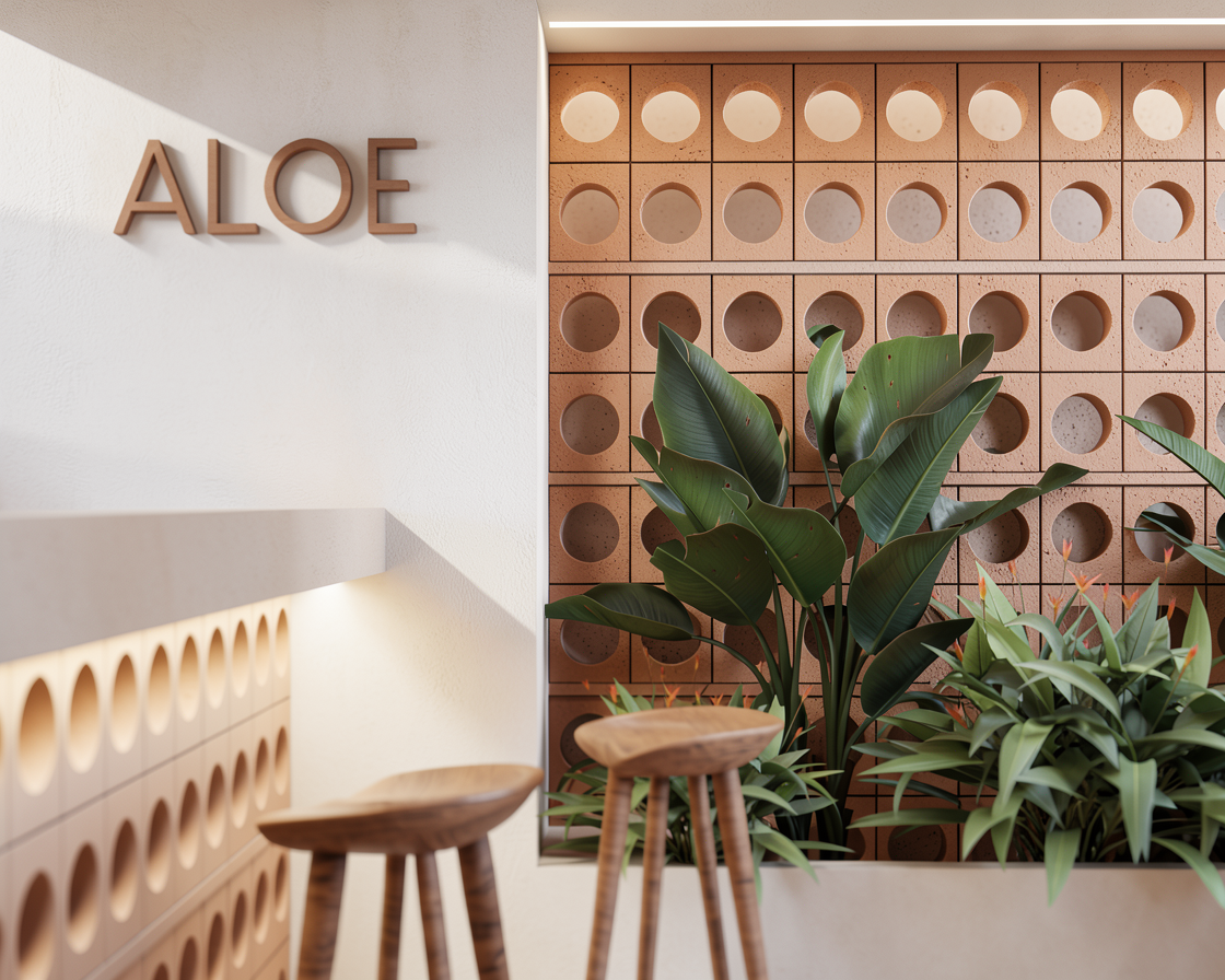photorealistic material refinement of the input image strict constraints preserve exact composition geometry lighting and camera do not modify focus or depth of field do not redesign any element material refinement primary goal terracotta lattice wall dry clay material mineral surface fine micro porosity small irregular pores slightly uneven surface not smooth subtle tonal variation between pieces matte low reflectivity soft light absorption surface must feel solid handcrafted clay not polished not perfect plaster walls very subtle mineral texture slightly uneven non uniform surface no smooth gradients no visible noise or dirt wood elements natural grain variation slight roughness non uniform reflectivity plants natural variation in green tones soft subsurface light response lighting keep original lighting exactly do not enhance do not beautify negative prompt plastic smooth shading soft gradients perfect surfaces glossy clean cgi polished uniform texture