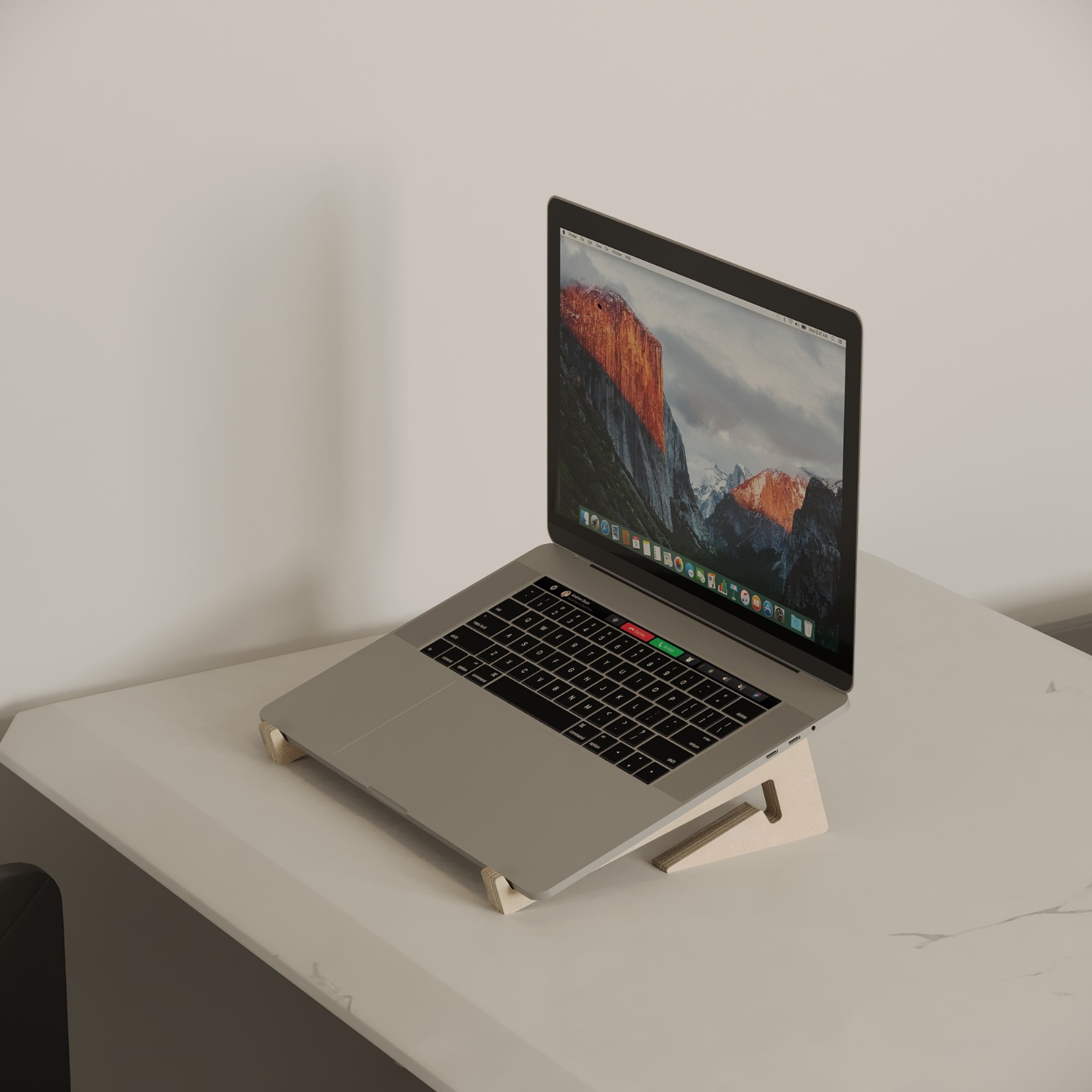 in a modern interior a laptop stand with a laptop on it is on the table the background is more blurry the laptop and stand are in the foreground
