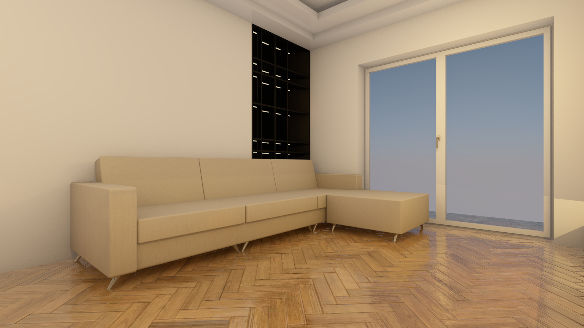 minimalist soft colors add led lights and minimal decorations add beige theme pillows and blanket on the sofa add a soft textured rug keep original nodes
